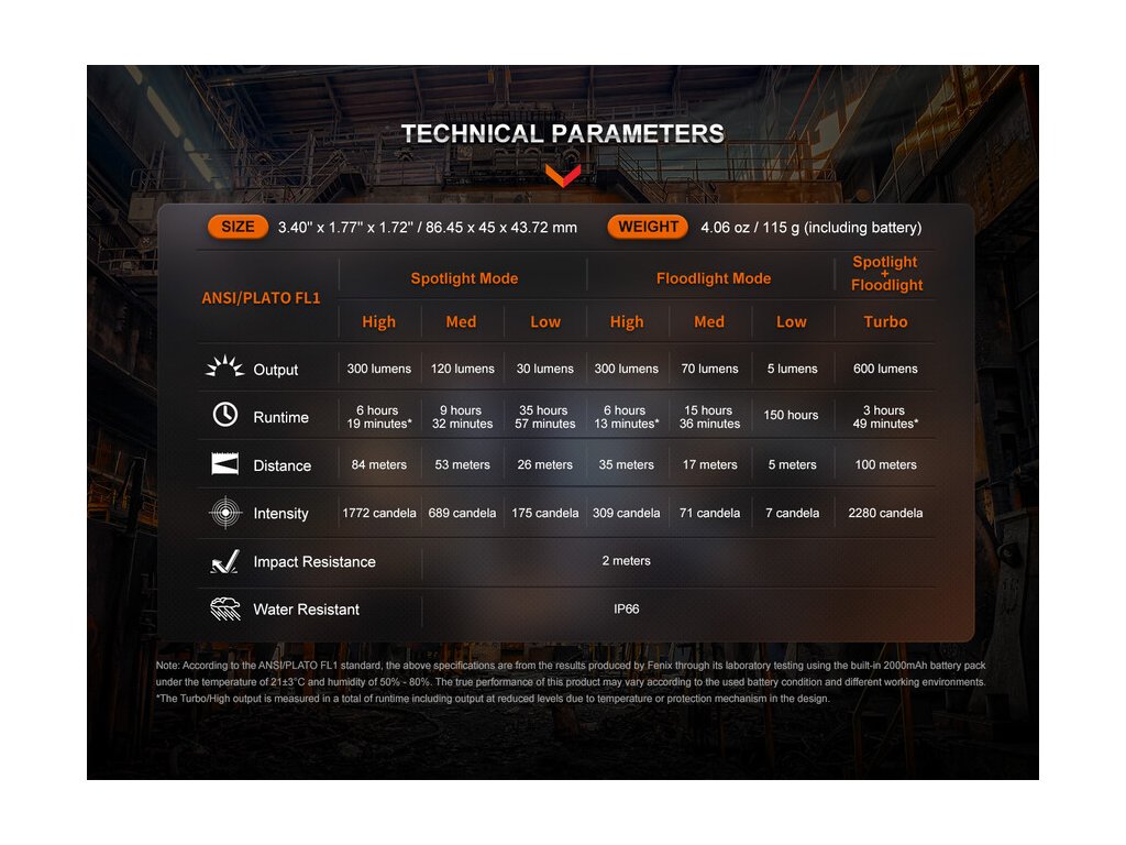 Všetky parametre svietidla (svetelný tok, doba prevádzky na batérie, vodotesnosť, dosvit a nárazuvzdornosť) sú zmerané v súlade s normou ANSI/ NEMA FL 1-2009.