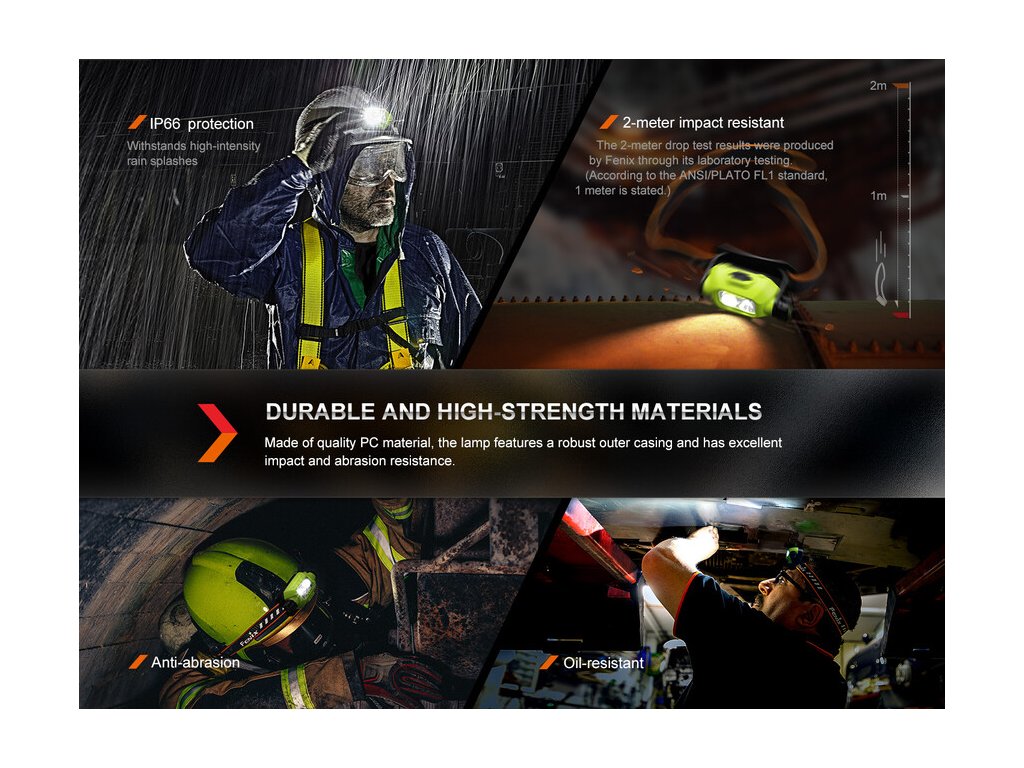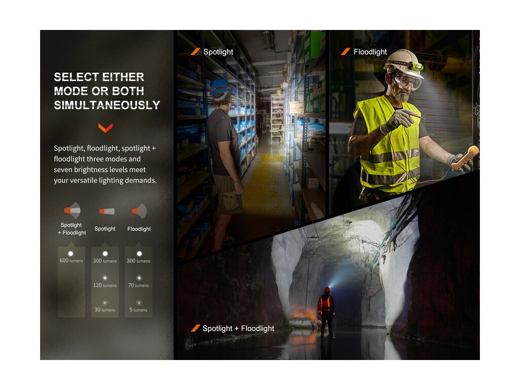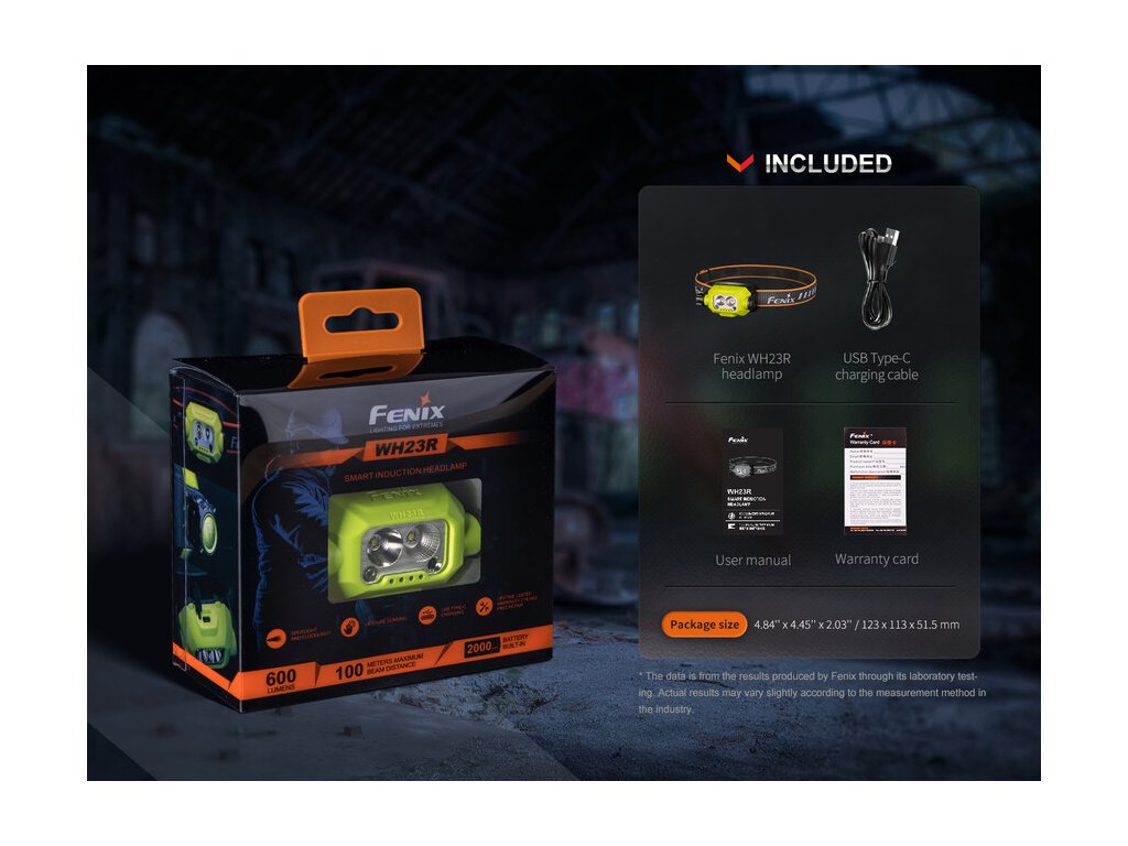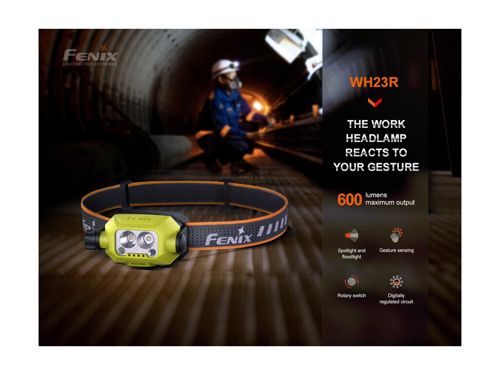 Fenix WH23R je dobíjateľná pracovná čelovka, ktorá sa vyznačuje vysokou odolnosťou voči pádu, unikátnou konštrukciou s dvoma reflektormi a funkciou pre bezdotykové zapínanie a vypínanie. Diaľkový reflektor vytvára mierne zaostrený svetelný lúč s dosvitom až 84 metrov a druhý reflektor má svetelnú stopu veľmi širokú a plynulú. Svetelný tok každého reflektora je až 300 lúmenov a ich svetlo je možné v Turbo režime skombinovať, do celkového výkonu 600 lúmenov. Na boku čelovky je otočný ovládač, ktorým je možné voliť štyri polohy: vypnutie - diaľkový reflektor - široký reflektor - Turbo režim. V polohách širokého a diaľkového reflektora je možné prepínať vždy tri stupne výkonu tlačidlom, ktoré je ukryté v otočnom ovládači.