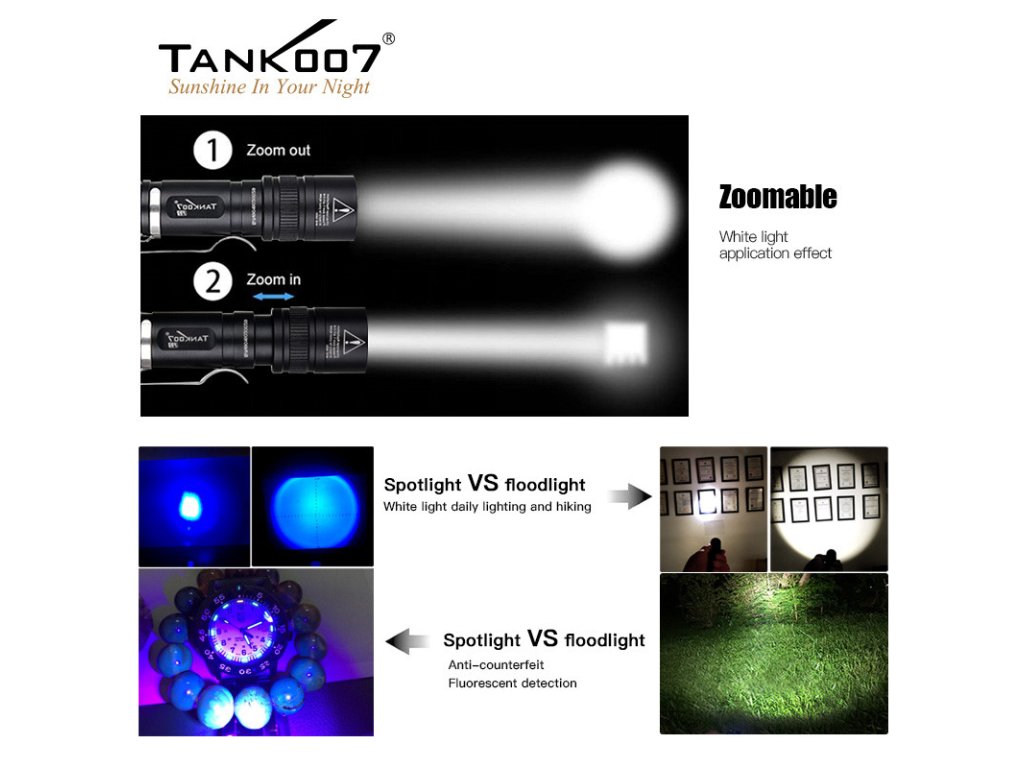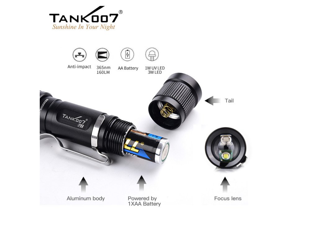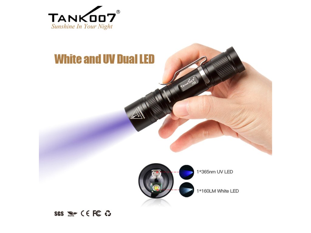 Táto unikátna LED baterka, kombinuje dva typy svetelných zdrojov v jednom kompaktnom tele – klasické výkonné biele svetlo pre všestranné osvetlenie a UV fluorescenčné svetlo, pre detekčné úlohy, ktoré bežné svietidlá nezvládnu. Tank007