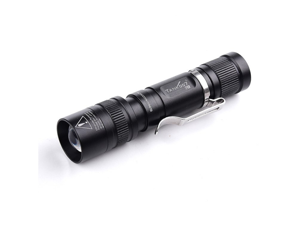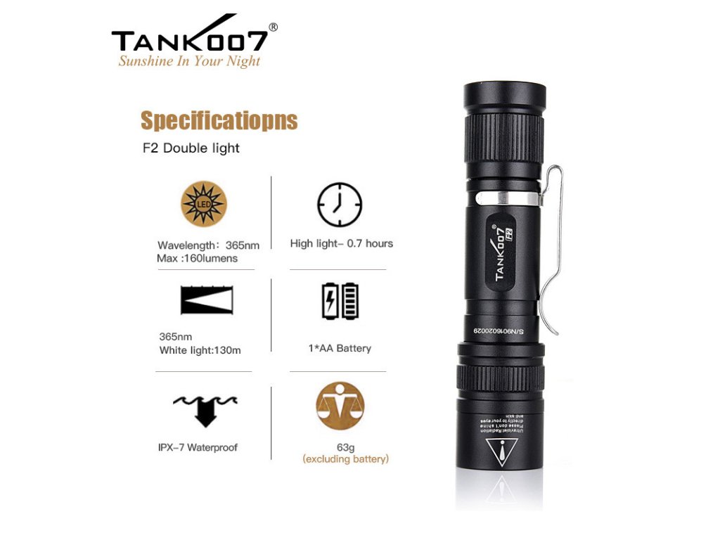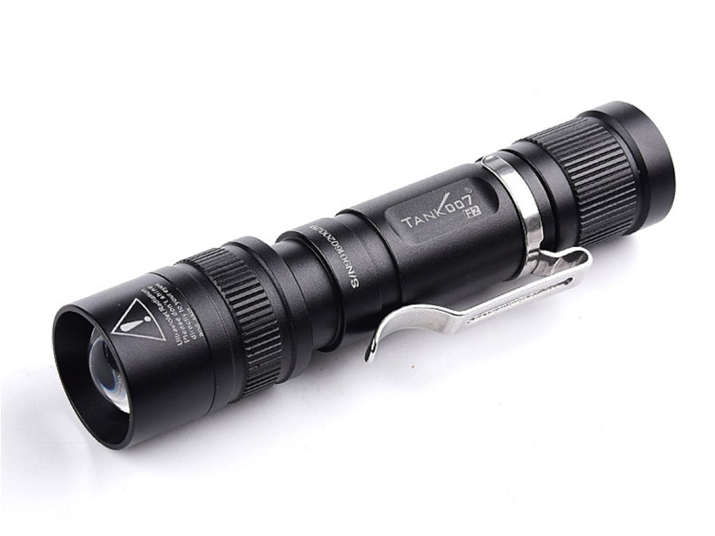 Tank007 F2 je duálna LED baterka so Zoom optikou – multifunkčná kompaktná LED baterka s dvojitým svetelným zdrojom: 3W Biela LED 160lm + 1W UV 365nm LED.