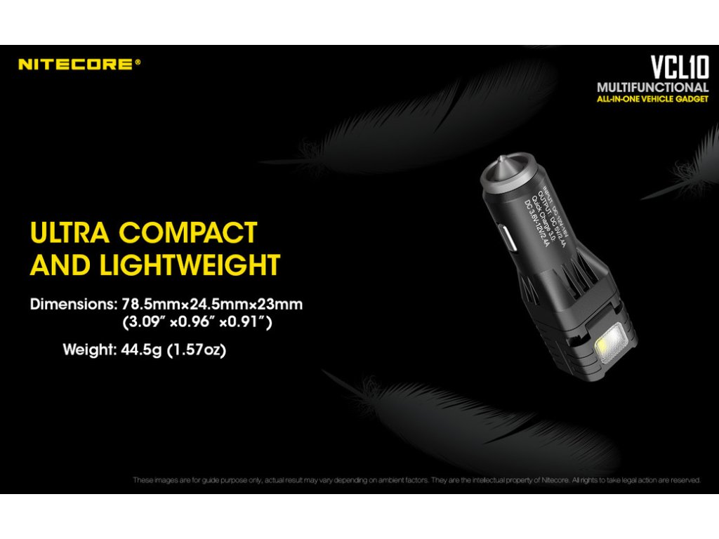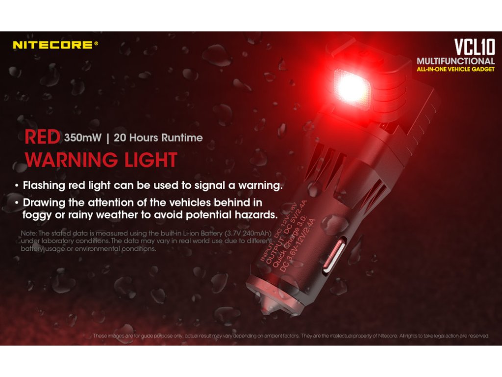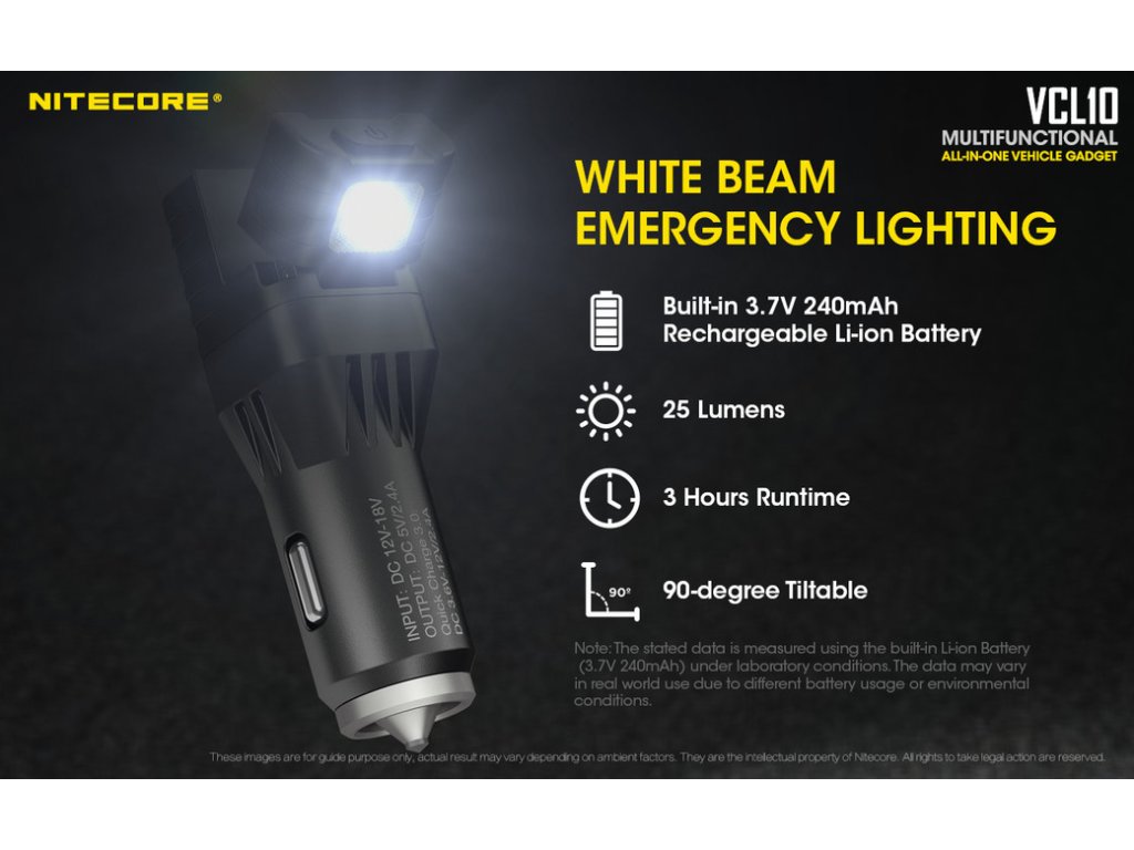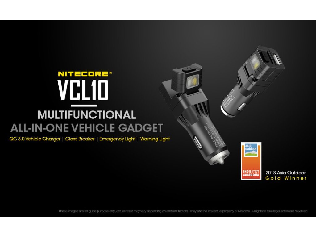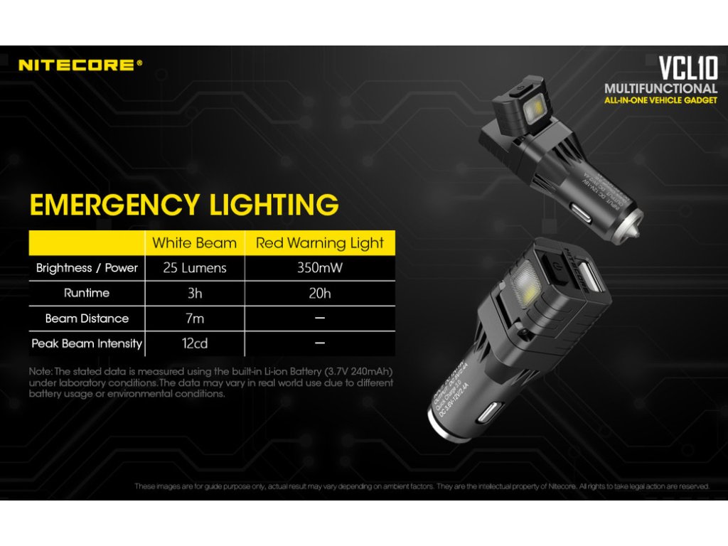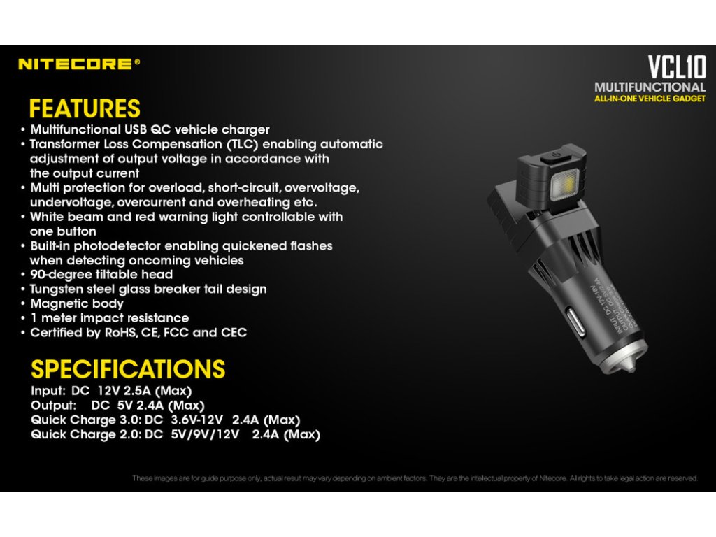 Nitecore VCL10 je vynikajúce multifunkčné zariadenie do auta, ktoré v sebe spája nabíjací autoadaptér, núdzové LED svietidlo (s bielou LED a výstražnou červenou blikcou LED) a rozbíjač skla. Vynikajúce na VCL10 je aj to, že má vstavaný Li-ion akumulátor s kapacitou 240mAh 3,7V, čiže dokáže svietiť aj bez externého napájania z auta. Takto dokáže svietiť nepretržite 3hod. Svetelná časť s LED je naklápacia o 90°. Biela LED poskytuje max. výkon 25lm a dosah svetla 7m. Červená blikavá LED je viditelná už z veľkej vzdialenosti. Vstup do autoadaptéra je DC 12V 2,5A (Max) a výstup DC 5V 2,4A (Max). Nabíjací USB slot je veľmi výkonný. Poskytuje kompatibilitu s technológiou nabíjania Qualcom 2.0 aj 3.0 s maximálnym výstupom nabíjania 2,4A. Takže Váš mobil alebo tablet bude nabitý raz dva. Kompatibilita je pre Android aj iOS zariadenia. Samozrejmosťou sú použité ochranné prvky, ako stabilizácia prúdu, ochrana proti skratu, a iné. Pomocou protokolu TLC je kolísavý prúd usmernený na stály, pre efektivitu nabíjania. Telo je vyrobené z nehorlavého tvrdeného plastu, pre čo najväčšiu bezpečnosť. Odoláva pádom z výšky 1m. Vašu bezpečnosť na ceste v krízových situáciách zabezpečuje jasné blikavé červené svetlo 350mW a dobou nepretržitého svietenia 20hod. Dokonca je opatrené fotodetektorom, ktorý detekuje blížiace sa svietiace predmety (nap. auto) a z pomalého blikania začne náhle rýchlo (upozorňujúco) blikať! Praktickosť VCL10 nekončí, zadná časť jeho tela je opatrená magnetom, pre jednoduché uchytenie na kovové predmety. Svetelná časť autoadaptéra poskytuje už spomínané 2 svetelné režimy: Svietenie biela LED a blikanie červená LED. Ďalej je toto zariadenie opatrené kovovým hrotom a slúži aj ako rozbíjač skla v krízových situáciách. Nitecore VCL10 je skĺbenie všetkého užitočného, čo potrebuje mať každý vodič v aute!