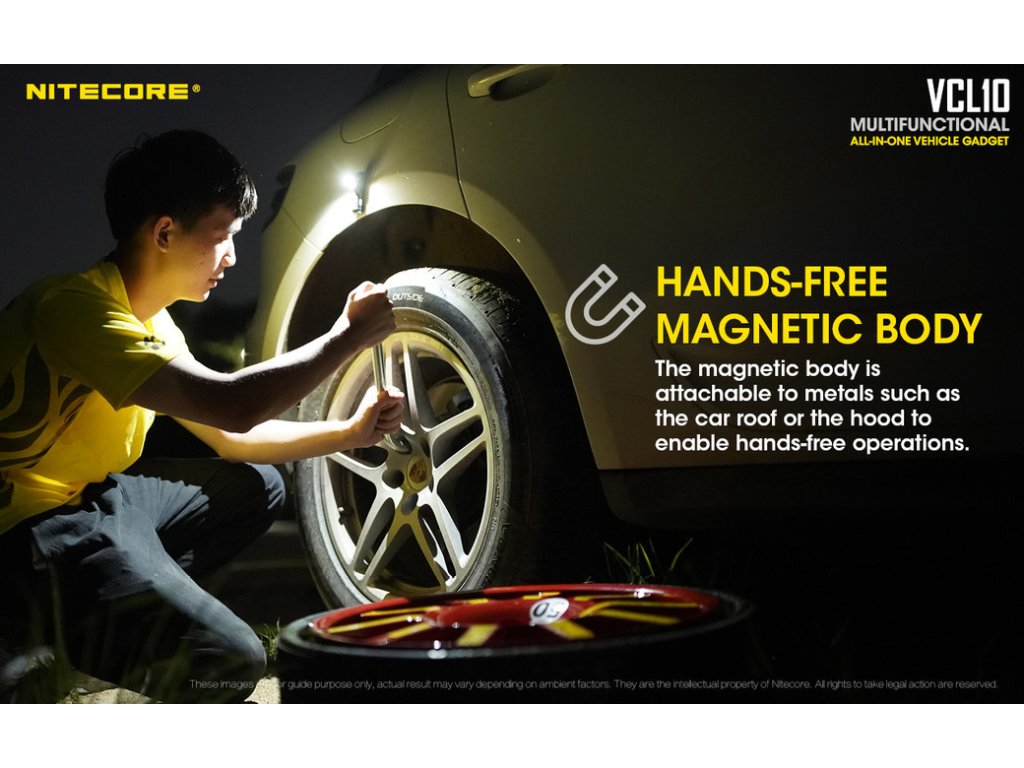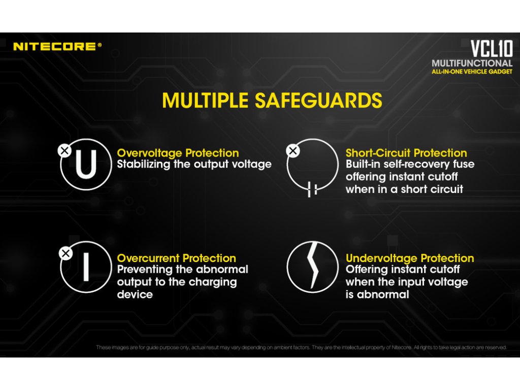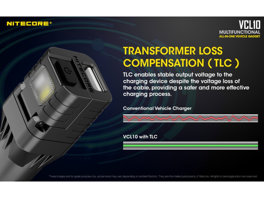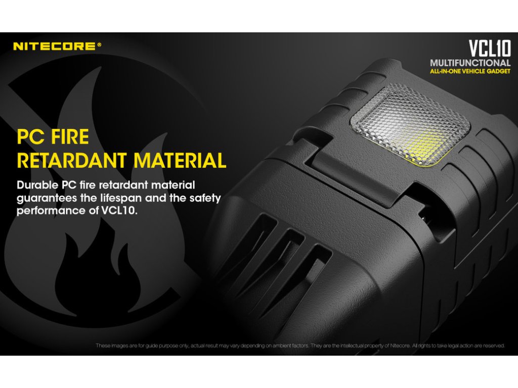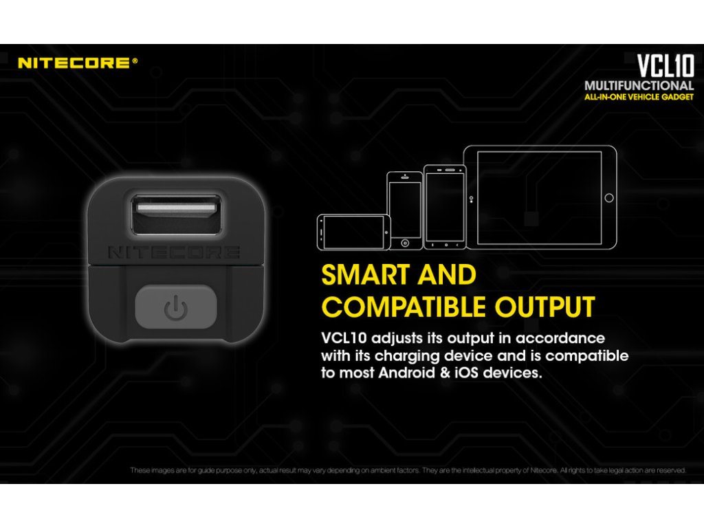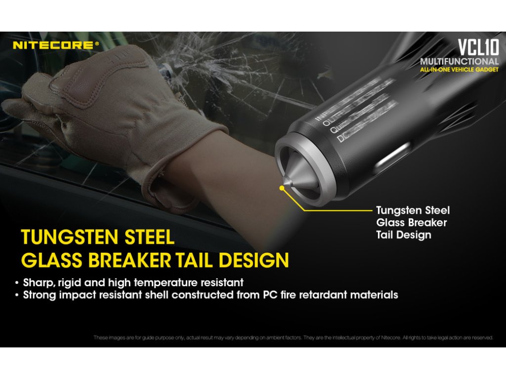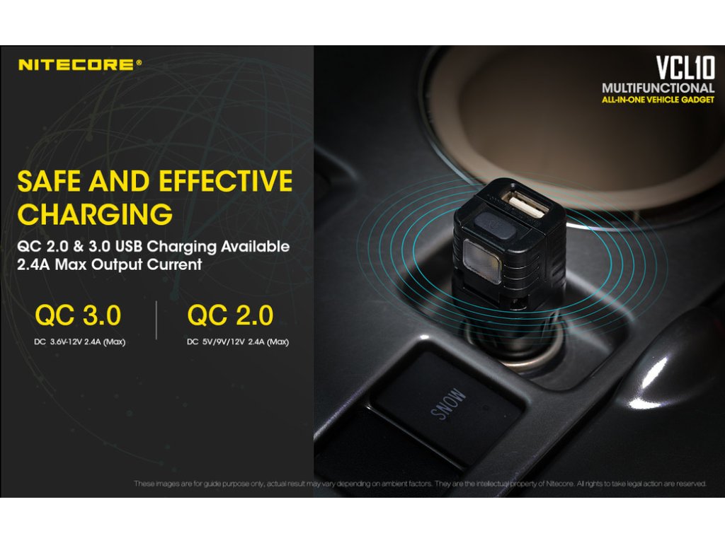 Nitecore VCL10 je vynikajúce multifunkčné zariadenie do auta, ktoré v sebe spája nabíjací autoadaptér, núdzové LED svietidlo (s bielou LED a výstražnou červenou blikcou LED) a rozbíjač skla. Vynikajúce na VCL10 je aj to, že má vstavaný Li-ion akumulátor s kapacitou 240mAh 3,7V, čiže dokáže svietiť aj bez externého napájania z auta. Takto dokáže svietiť nepretržite 3hod. Svetelná časť s LED je naklápacia o 90°. Biela LED poskytuje max. výkon 25lm a dosah svetla 7m. Červená blikavá LED je viditelná už z veľkej vzdialenosti. Vstup do autoadaptéra je DC 12V 2,5A (Max) a výstup DC 5V 2,4A (Max). Nabíjací USB slot je veľmi výkonný. Poskytuje kompatibilitu s technológiou nabíjania Qualcom 2.0 aj 3.0 s maximálnym výstupom nabíjania 2,4A. Takže Váš mobil alebo tablet bude nabitý raz dva. Kompatibilita je pre Android aj iOS zariadenia. Samozrejmosťou sú použité ochranné prvky, ako stabilizácia prúdu, ochrana proti skratu, a iné. Pomocou protokolu TLC je kolísavý prúd usmernený na stály, pre efektivitu nabíjania. Telo je vyrobené z nehorlavého tvrdeného plastu, pre čo najväčšiu bezpečnosť. Odoláva pádom z výšky 1m. Vašu bezpečnosť na ceste v krízových situáciách zabezpečuje jasné blikavé červené svetlo 350mW a dobou nepretržitého svietenia 20hod. Dokonca je opatrené fotodetektorom, ktorý detekuje blížiace sa svietiace predmety (nap. auto) a z pomalého blikania začne náhle rýchlo (upozorňujúco) blikať! Praktickosť VCL10 nekončí, zadná časť jeho tela je opatrená magnetom, pre jednoduché uchytenie na kovové predmety. Svetelná časť autoadaptéra poskytuje už spomínané 2 svetelné režimy: Svietenie biela LED a blikanie červená LED. Ďalej je toto zariadenie opatrené kovovým hrotom a slúži aj ako rozbíjač skla v krízových situáciách. Nitecore VCL10 je skĺbenie všetkého užitočného, čo potrebuje mať každý vodič v aute!