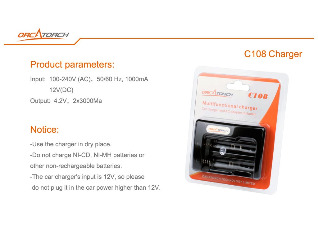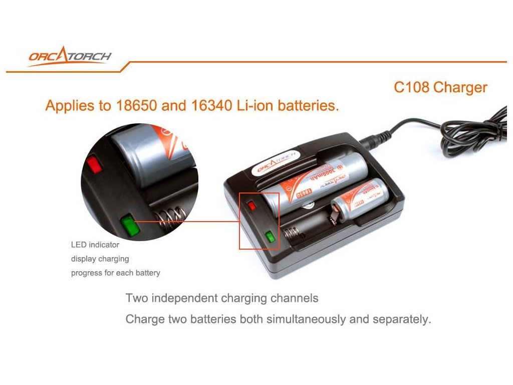 Ak chcete udržať akumulátory plne nabité a pripravené na použitie, nabíjačka Orcatorch C108 je to, čo hľadáte. Orcatorch C108 nabíja Li-ion akumulátory 18650 a 16340 3,6/ 3,7V. Podporuje AC a DC nabíjanie s adaptérmi pre oba zdroje napájania. Nabíjacia jednotka má pre každý slot farebnú indikačnú LED. K dispozícii sú 2 nezávislé nabíjacie kanály, ktoré vám umožňujú nabíjať akumulátory súčasne a samostatne. Nabíjačka je vybavená ochranou pred: skratom, preťažením, nadprúdovým napätím. Nabíjanie prebieha s konštantným prúdom 1000mA pre jednu šachtu, ktorý predlžuje životnosť akumulátora. Pre obe šachty je nabíjací prúd 300mA. Nabíjačka sa môže používať so zdrojom napájania (AC) 100 až 240V, 50/ 60Hz, 1000mA 12V (DC).