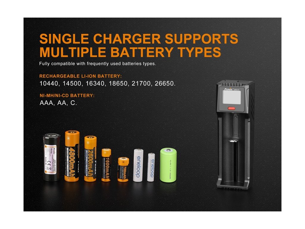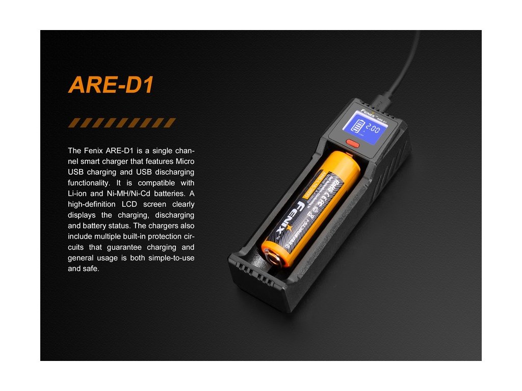 Kompaktná univerzálna USB nabíjačka Fenix ARE-D1 na jeden kus Li-ion alebo NiMH/ NiCd akumulátora. Nabíjací prúd až 2000 mA (pre NiMh/ NiCd je maximálny nabíjací prúd 1000 mA), podľa možností USB zdroja do ktorého budete mať nabíjačku pripojenú (počítač, sieťový USB zdroj, nabíjačka na mobilný telefón s micro USB). Pri vložení nabitého akumulátora, funguje aj ako záložný zdroj (Power bank) pre nabíjanie USB zariadení (mobilné telefóny, MP3 prehrávače a ďalšie). Vďaka kompaktným rozmerom je nabíjačka vhodná zvlášť na cesty. Automaticky rozpozná vložený typ akumulátora a zvolí optimálny nabíjací algoritmus. Nabíjačka je vybavená LCD displejom, ktorý zobrazuje aktuálne napätie akumulátorov, typ nabíjaných batérií a ďalšie informácie.