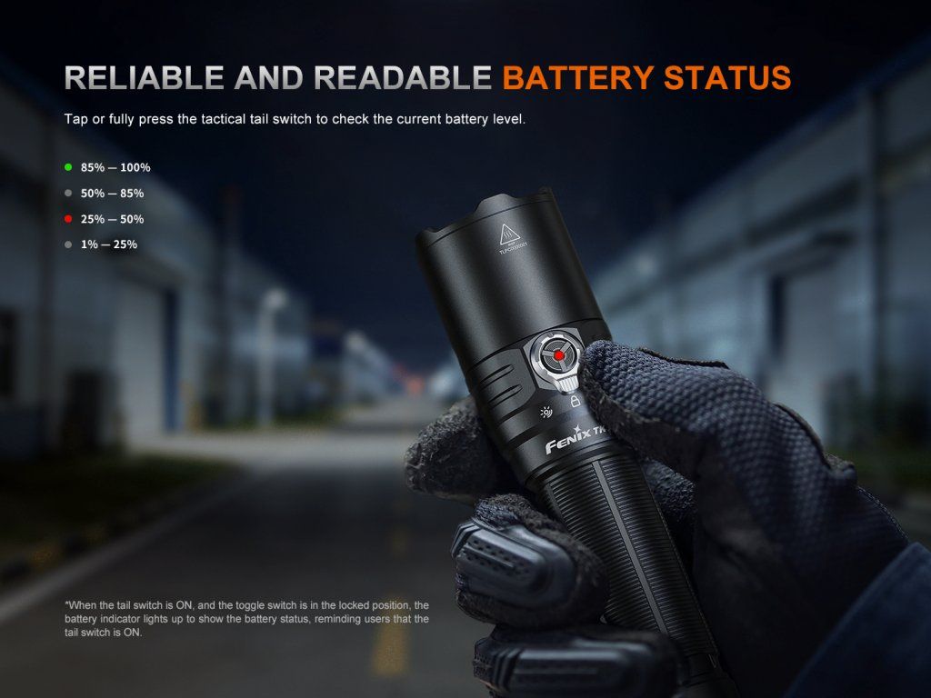 Indikácia stavu nabitia batérie - svietidlo vždy indikuje stav nabitia batérie tri sekundy po zapnutí. Zelená značí nabitie na 100% - 85%, zelené blikanie (85% - 50%), stále červené (50% - 25%) a blikajúca červená značí kriticky vybitý akumulátor (menej ako 25%). Pokiaľ napätie klesne pod nastavenú úroveň, svietidlo zníži jas na nižší stupeň.