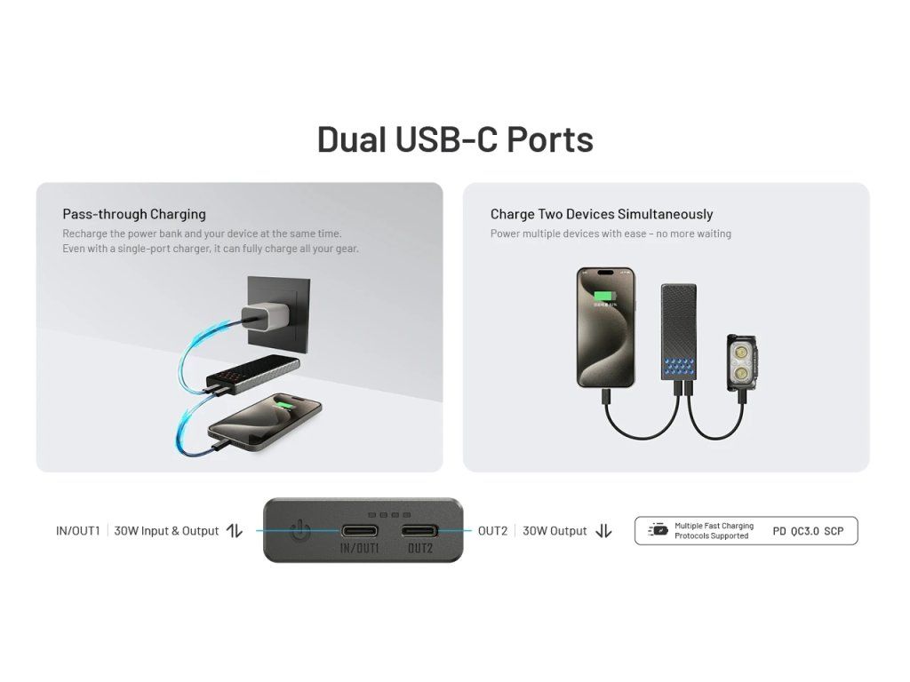 - Súbežné nabíjanie: Môžete nabíjať dve zariadenia naraz (cez USB-C aj USB-A port), pričom celkový zdieľaný výstup bude stabilných 15W.