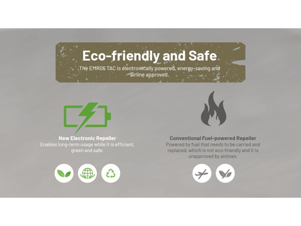 EMR06 TAC disponuje pokročilou elektronikou, ktorá umožňuje funkciu Pass-through. To znamená, že ak sa vám vybije interná batéria, môžete prístroj pripojiť k powerbanke a on bude pokračovať v odpudzovaní hmyzu počas nabíjania. USB-C port je ergonomicky umiestnený tak, aby kábel neprekážal pri nosení na výstroji.