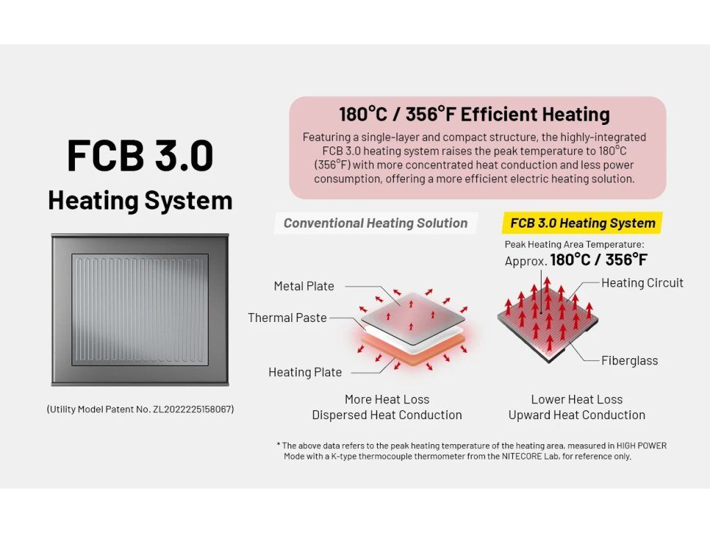 Nitecore EMR23 je vybavený najnovšou generáciou systému FCB 3.0 (Fully Circuit Board). Táto technológia precízne izoluje tepelné jadro od zvyšku elektroniky, čím zabezpečuje, že 95 % tepla smeruje priamo do vankúšika. Výsledkom je bleskové nahriatie na 180 °C, zatiaľ čo telo prístroja ostáva chladné. Tento systém navyše predlžuje životnosť batérií, pretože zabraňuje ich zbytočnému prehrievaniu počas prevádzky.