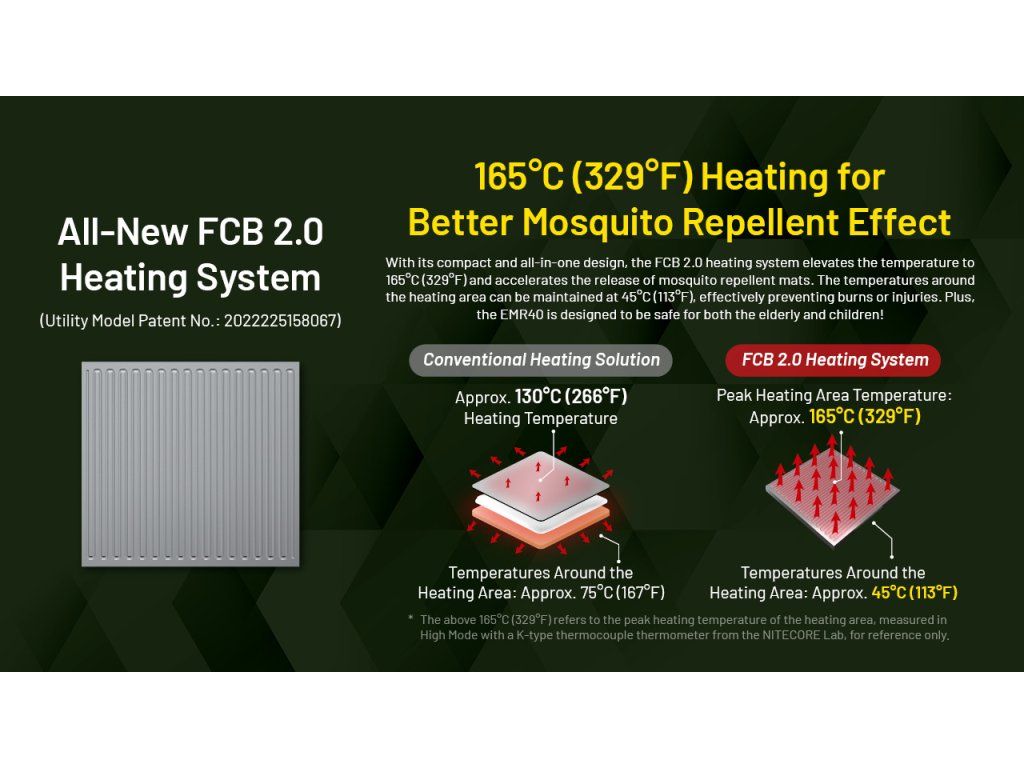 Na rozdiel od lacných odpudzovačov využíva Nitecore EMR40 patentovaný systém FCB 2.0 (Fully Circuit Board). Tento systém izoluje tepelné jadro od vonkajšieho šasi, čo znižuje teplotu povrchu o viac ako 40 % v porovnaní s predchádzajúcimi generáciami. Výsledkom je efektívnejšie uvoľňovanie repelentnej látky a vyššia energetická efektivita.