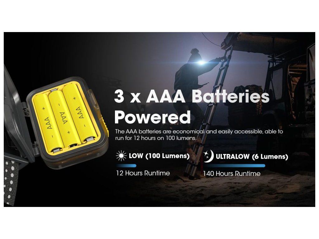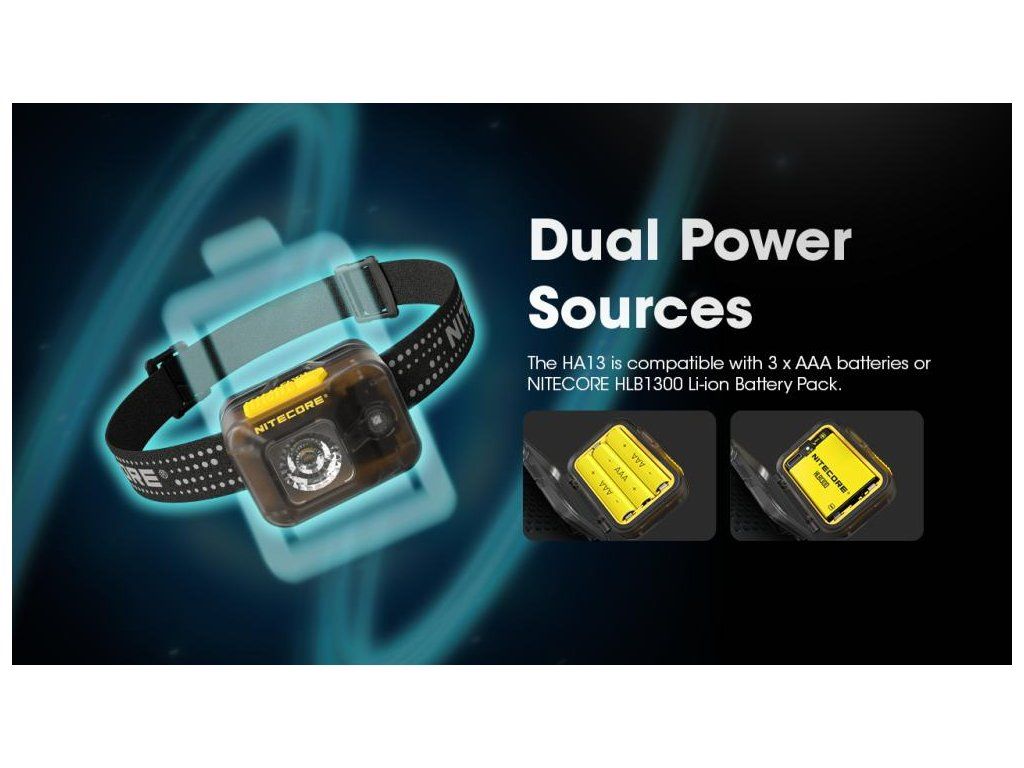 Inžinieri v Nitecore vyvinuli model HA13 s dôrazom na univerzálnosť. Použitie 3 kusov AAA batérií (alkalických, Ni-MH alebo lítiových) zaručuje, že svetlo spojazdníte aj v tej najodľahlejšej horskej chate. Ak však preferujete ekonomickú prevádzku, stačí vložiť Li-ion pack HLB1300, ktorý z čelovky urobí plne dobíjateľné zariadenie.