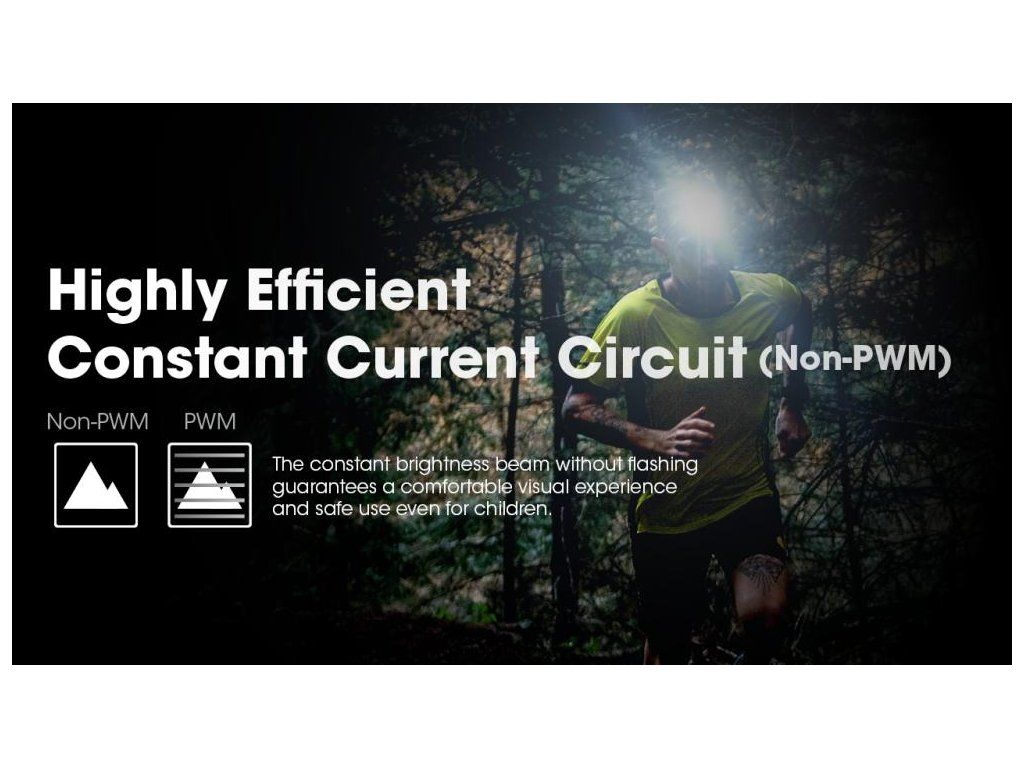 Vysokoúčinný obvod konštantného prúdu (Non-PWM) zaisťuje stabilný svetelný tok bez nepríjemného blikania, čo výrazne šetrí váš zrak pri dlhodobom používaní. Čelovka je vybavená aj ochranou proti prepólovaniu v prípade nesprávneho vloženia batérií.