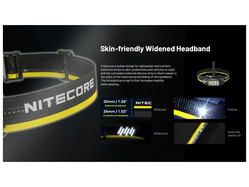Držiak čelovky je tvarovaný tak, aby presne kopíroval čelo. Popruh je perforovaný pre lepší odvod potu a obsahuje reflexné prvky zvyšujúce bezpečnosť pri pohybe na cestách. Ťažisko je posunuté bližšie k hlave, čo minimalizuje nepríjemné vibrácie pri behu.
