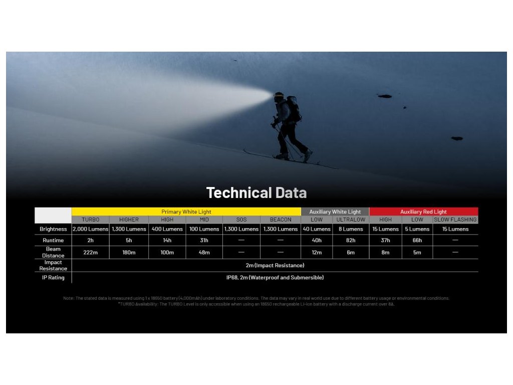 | Turbo | 2000 lm | 2h | 222 m | 12 293 cd |