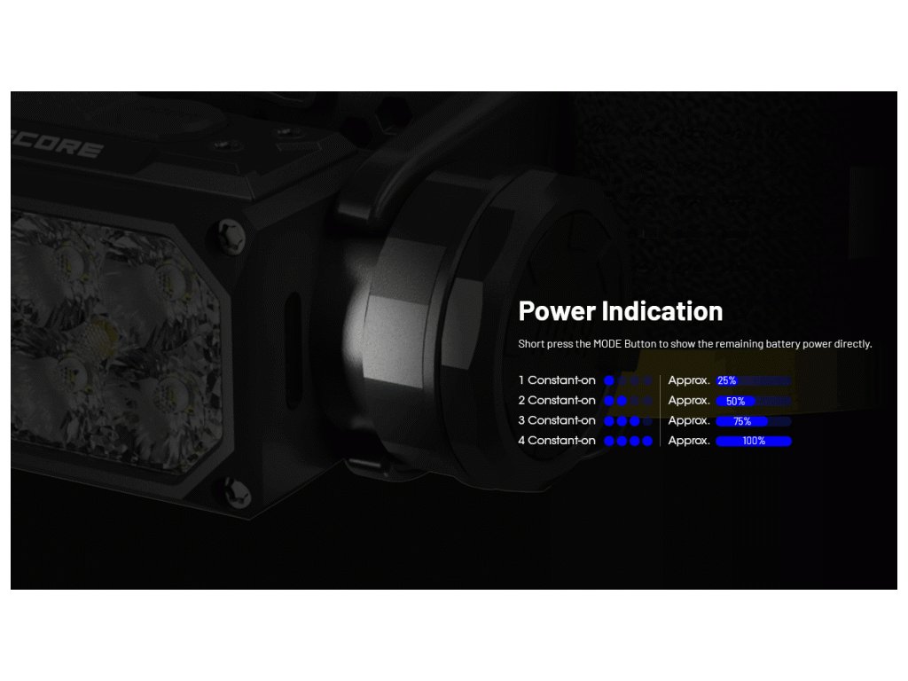 - Pomocné svetlá: Pri vypnutej čelovke dvojitým stlačením tlačidla Mode aktivujete červené svetlo. Následným klikaním prepínate medzi Červená (Low) > Červená (High) > Biela High CRI.
