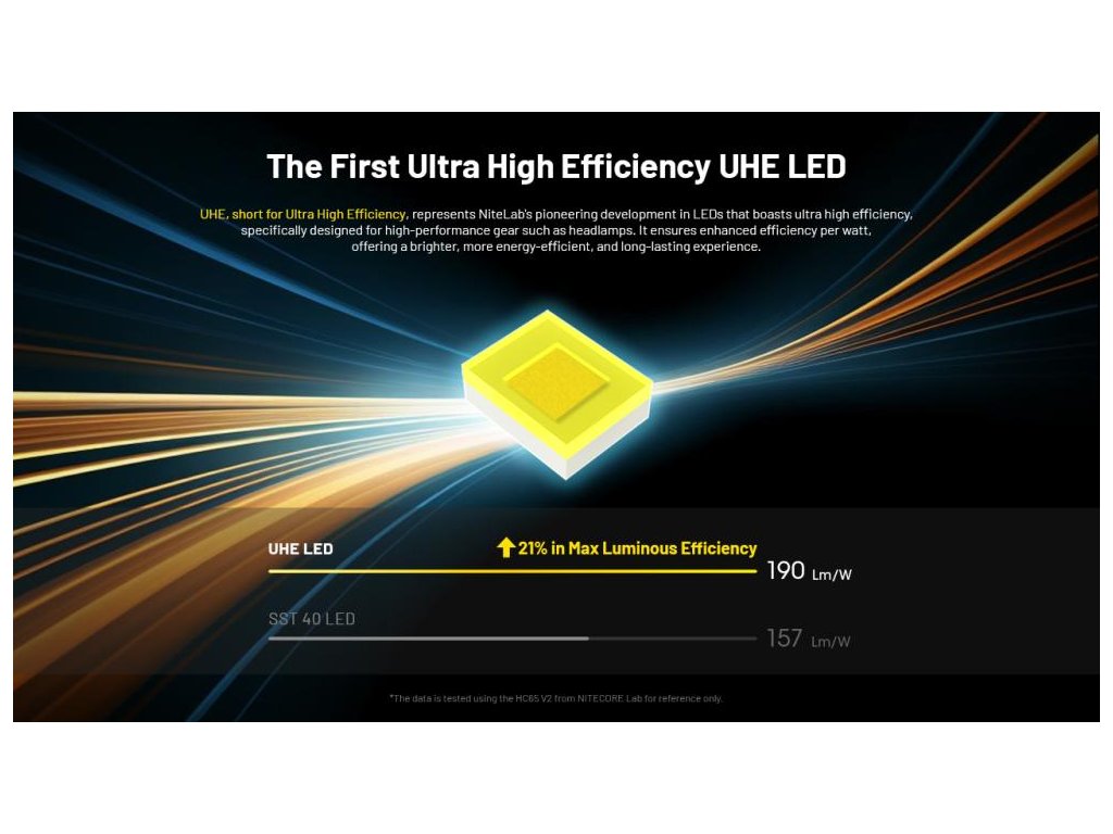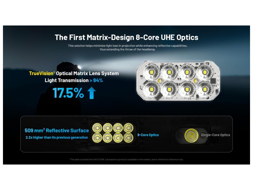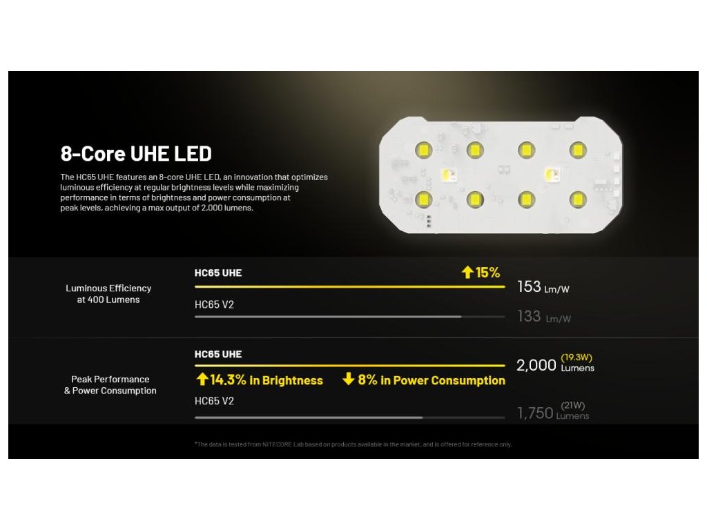 Nitecore HC65 UHE využíva matricový systém s ôsmimi jadrami NiteLab UHE LED. Táto technológia prekonáva tradičné single-LED riešenia lepšou tepelnou distribúciou a vyšším koeficientom odrazivosti. Výsledkom je mäkké, ale intenzívne osvetlenie s pozoruhodnou penetráciou tmy pri nižšej spotrebe energie.