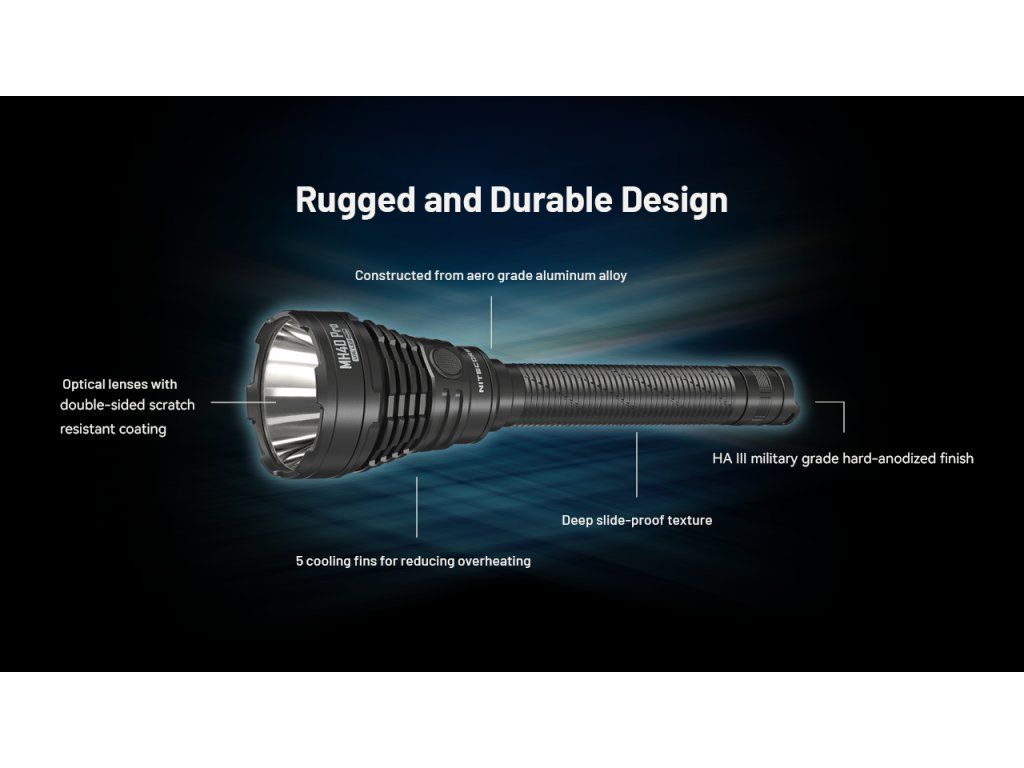 Telo je vyrobené z tvrdenej hliníkovej zliatiny používanej v leteckom priemysle, ošetrené eloxovaním typu HA III Military grade. Svietidlo je odolné voči nárazom a disponuje krytím IP68. Chladiace rebrá v oblasti hlavy efektívne odvádzajú teplo z elektroniky, čím predlžujú životnosť komponentov a udržujú stabilný výkon.