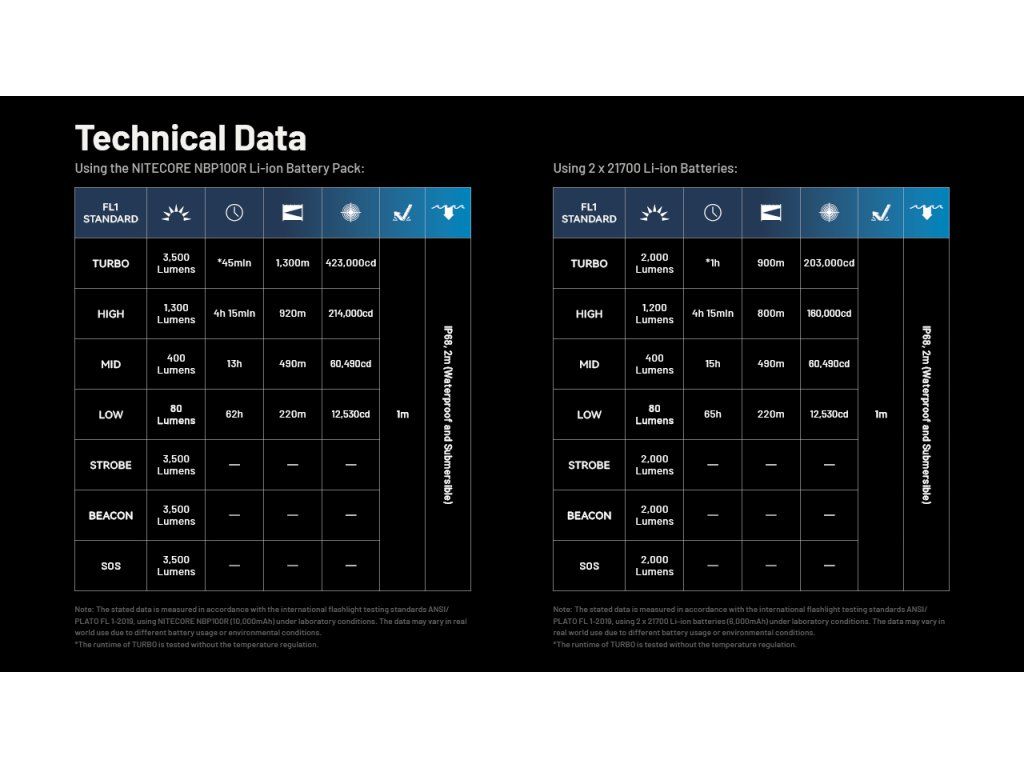 | Turbo | 3500 lm | 45 min* | 1300 m | 422 500 cd |