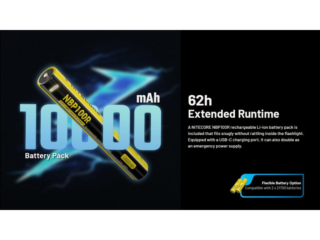 Napájanie zabezpečuje špeciálne navrhnutý akumulátor BP-21, ktorý v sebe integruje kapacitu dvoch článkov typu 21700 (celkovo 10 000 mAh). Inteligentný nabíjací okruh cez USB-C podporuje protokoly rýchleho nabíjania, čím minimalizuje prestoje. Unikátnou funkciou je vibračný motorček, ktorý jemným chvením signalizuje, keď kapacita batérie klesne pod 10 %, čo je v taktických situáciách oveľa diskrétnejšie ako blikanie hlavnej LED.