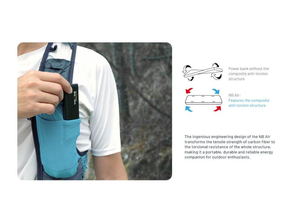 Na rozdiel od bežných plastových alebo hliníkových powerbánk je NB Air postavená na báze polyméru vystuženého uhlíkovými vláknami (CFRP). Tento materiál poskytuje nielen ikonický priemyselný vzhľad, ale najmä funkčnú ochranu vnútorného Li-ion článku. Karbónové panely sú spojené špeciálnou technológiou, ktorá zabezpečuje stabilitu aj pri mechanickom tlaku, ktorý by bežné puzdrá deformoval.