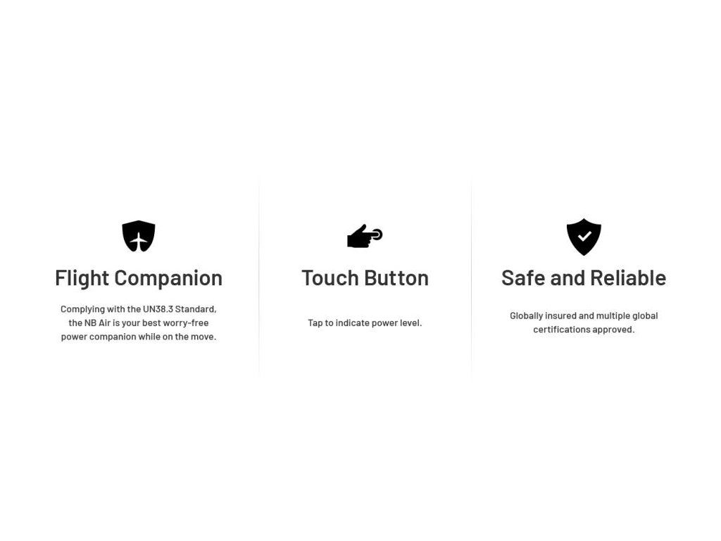 NB Air 5000mAh je vybavená komplexnou ochranou proti skratu, prebitiu, hlbokému vybitiu a prehriatiu. Vďaka optimalizovanému manažmentu si udržuje stabilnú teplotu aj pri maximálnom odbere. S energetickou hodnotou 18,5 Wh je plne schválená pre leteckú prepravu v príručnej batožine podľa medzinárodných noriem UN38.3.