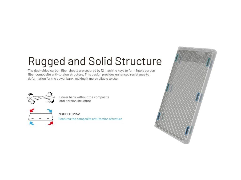 Na rozdiel od bežných powerbánk, ktoré používajú plastové alebo hliníkové obaly, NB10000 GEN3 využíva Carbon Fiber Reinforced Polymer (CFRP). Tento materiál zabezpečuje nielen minimálnu váhu, ale aj vysokú štrukturálnu integritu. Bočné panely sú tkané z uhlíkových vlákien, čo efektívne tlmí nárazy a chráni Li-ion články pred prepichnutím alebo deformáciou, čo je kľúčové pre bezpečnosť pri outdoorových aktivitách.