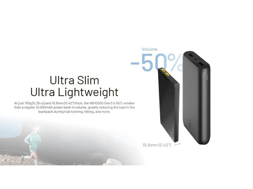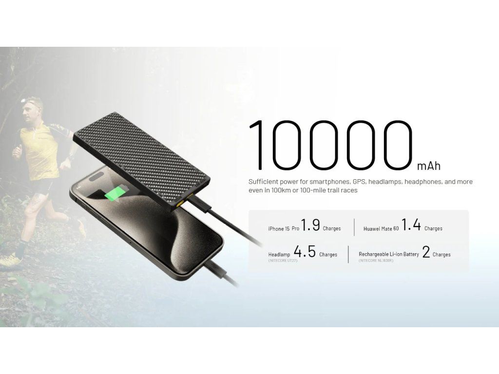 Elitná ultralight powerbanka Nitecore NB10000 GEN3 s hmotnosťou iba 150g a rámom z uhlíkových vlákien. Ponúka 22,5W rýchlonabíjanie, dva USB-C porty a odolnosť IPX5, čím sa stáva povinnou výbavou pre každého trailového bežca a turistu.