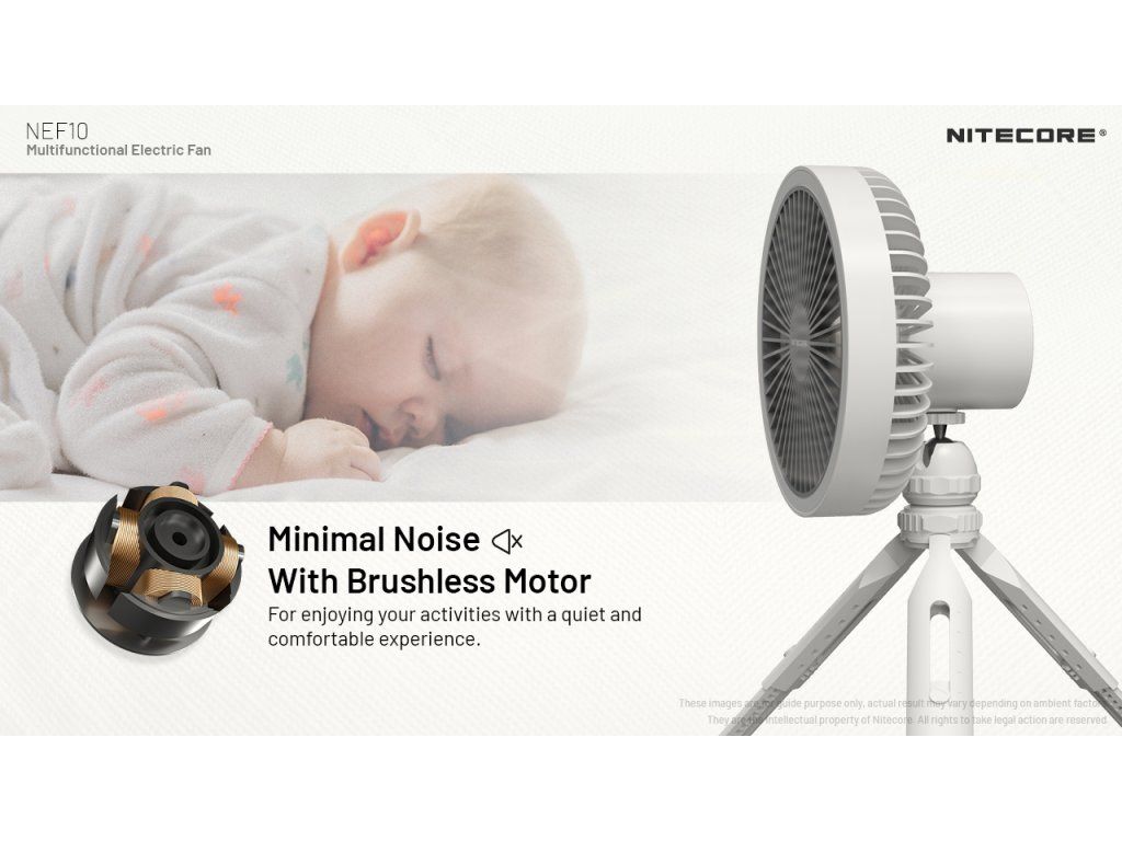 Nitecore NEF10 využíva päťlistovú vrtuľu poháňanú bezkefkovým (brushless) jednosmerným motorom. Tento typ motora zaručuje nielen dlhú životnosť bez mechanického opotrebenia, ale predovšetkým mimoriadne hladký a tichý chod. Špeciálne tvarované lopatky ventilátora minimalizujú turbulencie, čo umožňuje prístroju generovať silný prúd vzduchu aj pri nižších otáčkach, čím sa dramaticky šetrí energia batérie.