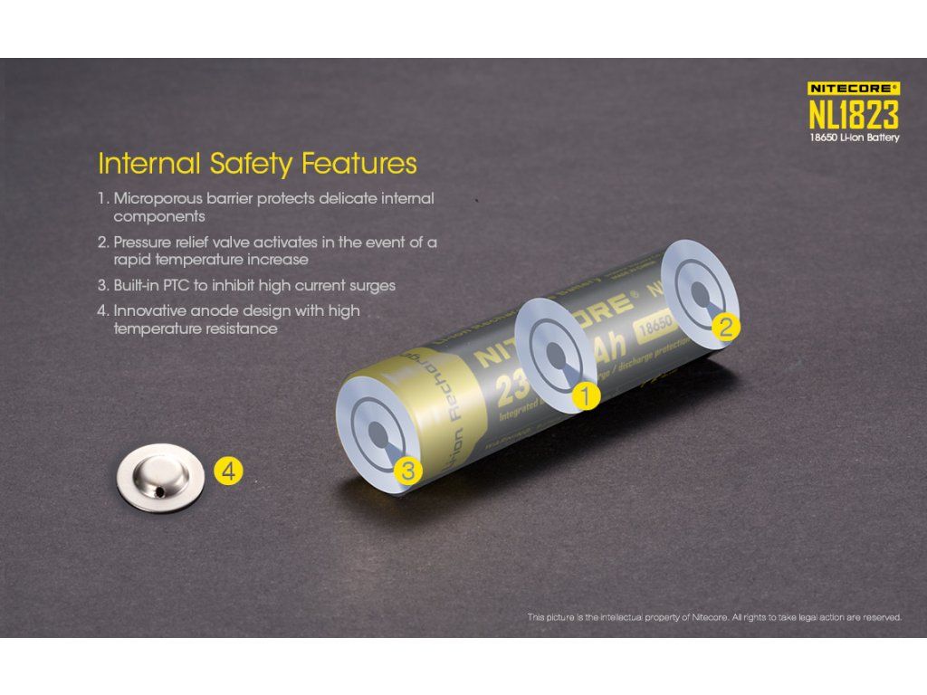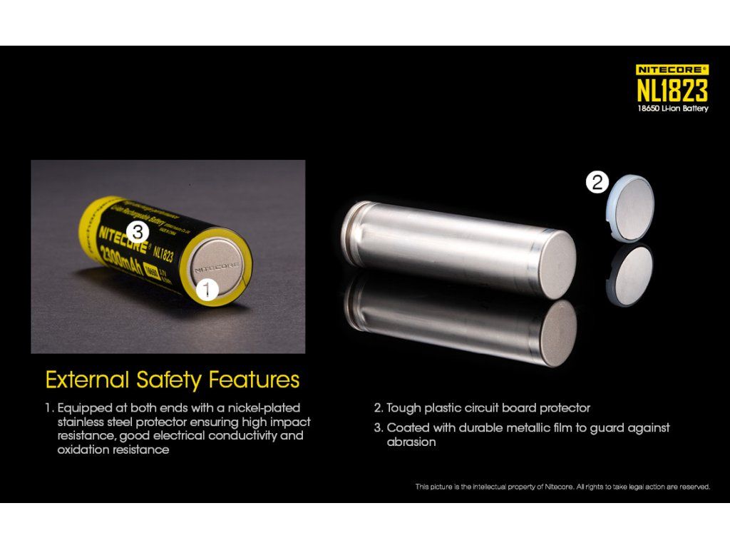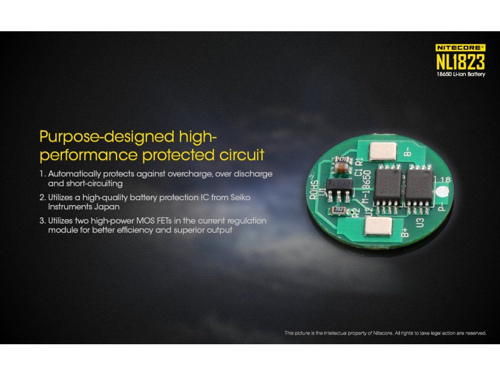 Na rozdiel od bežných Li-ion článkov je NL1823 vybavený sofistikovaným elektronickým obvodom umiestneným na anóde. Tento obvod využíva dva vysokovýkonné MOSFET moduly, ktoré v reálnom čase monitorujú tok energie a v prípade detekcie kritických hodnôt (skrat, napätie nad 4.25V alebo pod 2.4V) okamžite prerušia obvod. Tým je chránená nielen batéria, ale aj vaše drahé zariadenie.
