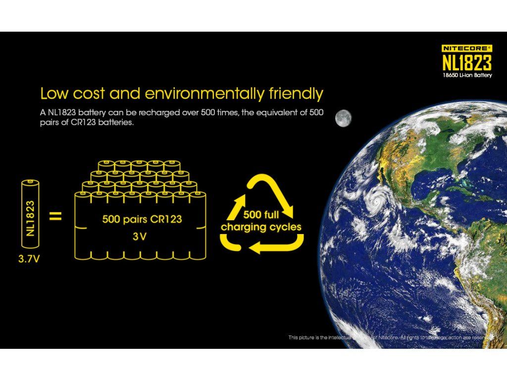 Používaním Nitecore NL1823 aktívne znižujete uhlíkovú stopu. Jeden tento akumulátor nahradí počas svojej životnosti viac ako 500 sád primárnych batérií CR123A, čo predstavuje výraznú finančnú úsporu a minimalizáciu toxického odpadu.