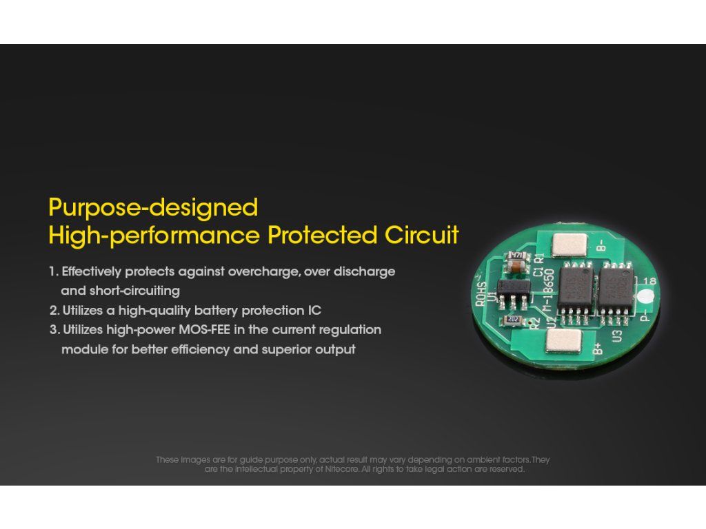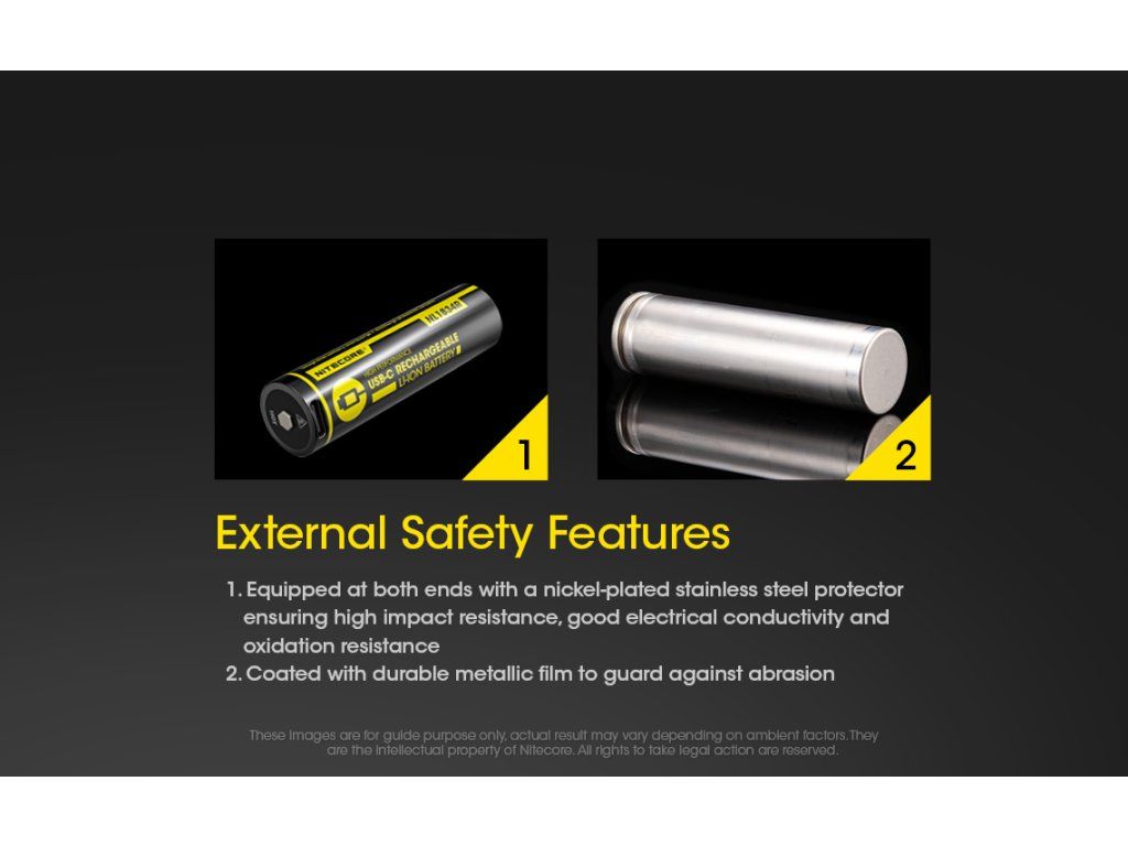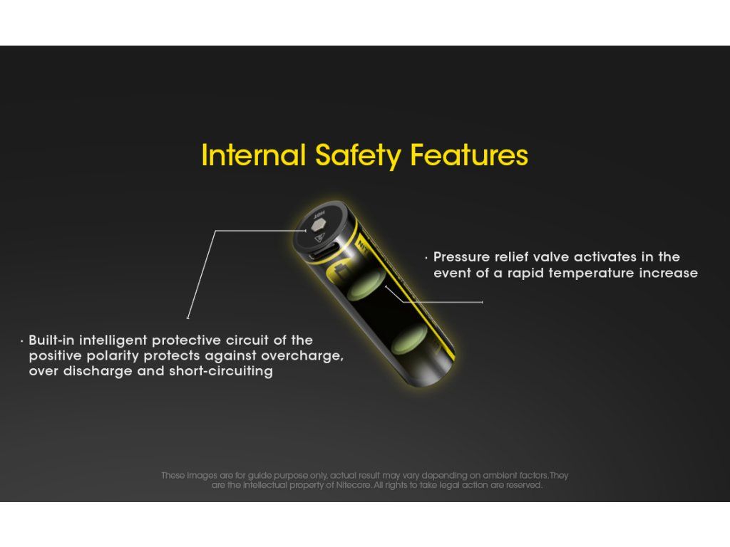 Nitecore neponechal nič na náhodu. Akumulátor disponuje zabudovaným tlakovým ventilom, ktorý sa aktivuje v nepravdepodobnom prípade prudkého nárastu teploty a tlaku. Mikroporézna bariéra medzi vrstvami článku minimalizuje riziko vnútorného skratu. Celý článok je obalený poniklovaným nerezovým plechom, ktorý zabezpečuje vysokú odolnosť proti nárazom a oxidácii kontaktov.
