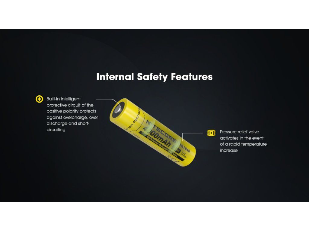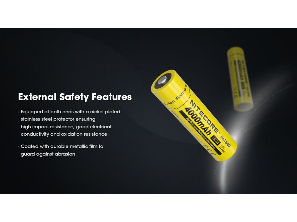 Bezpečnosť je u Nitecore na prvom mieste. Článok obsahuje mikroporézny bariérový separátor, ktorý chráni vnútorné komponenty, a zabudovaný tlakový poistný ventil, ktorý sa otvorí pri nadmernom tlaku spôsobenom prehriatím. Vonkajší obal z nerezovej ocele typu 304 zabezpečuje integritu pri nárazoch.