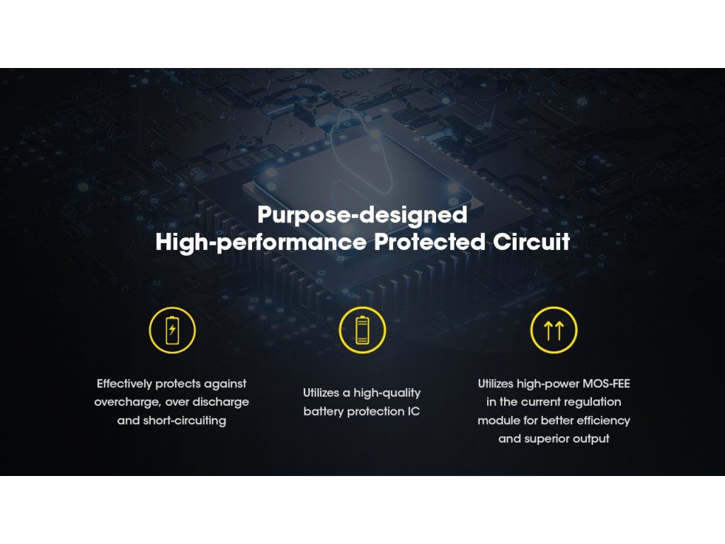 Riadiaci čip (PCB) je umiestnený na kladnom póle, čo zvyšuje odolnosť voči mechanickému poškodeniu pri páde baterky na zem. Tento obvod neustále monitoruje napätie a prúd, čím predchádza kritickým stavom, ktoré by mohli poškodiť akumulátor alebo samotné svietidlo.
