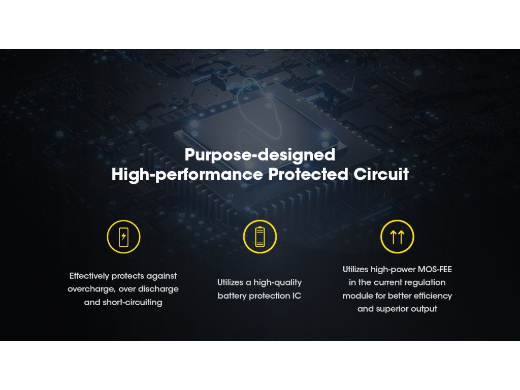 V hornej časti článku sa nachádza mikroprocesorom riadený ochranný obvod (BMS), ktorý nepretržite monitoruje napätie a prúd. Tento obvod chráni akumulátor pred kritickým vybitím pod 2.5V a prebitím nad 4.25V. Zároveň slúži ako bariéra proti skratu, čím eliminuje riziko požiaru alebo poškodenia drahého svietidla.