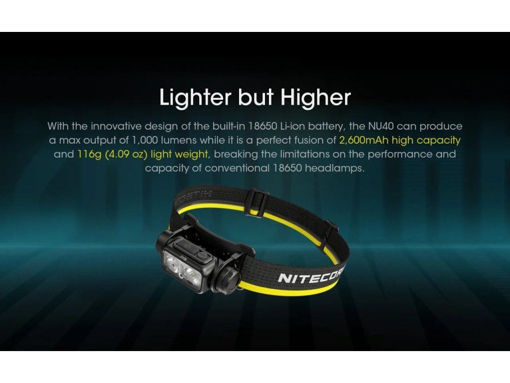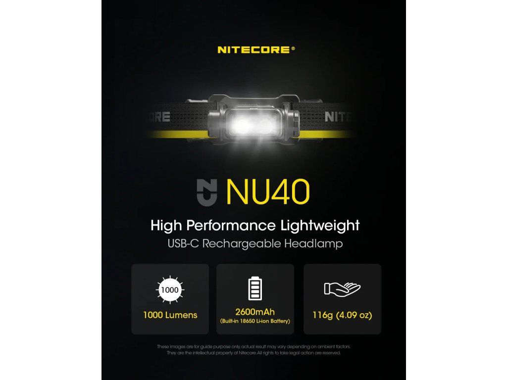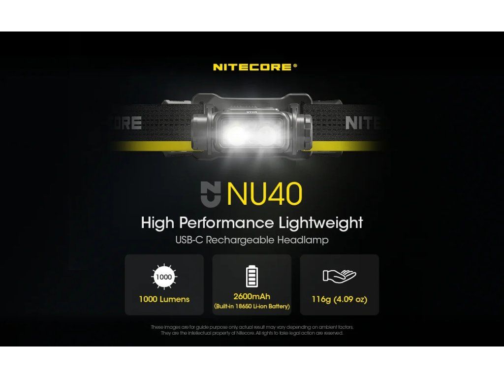 Nitecore NU40 1000 lm – Ultraľahká nabíjacia čelovka s USB-C 1000 lm | 121 m | Integrovaná 2600mAh | IP68