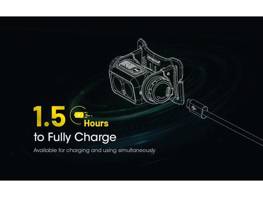 Integrovaný USB-C port je chránený otočným mechanickým krytom, ktorý poskytuje fyzickú bariéru proti prachu a vode. Čelovka disponuje inteligentným obvodom, ktorý chráni batériu pred prebitím, podbitím a skratom, čím predlžuje životnosť článku na maximum.