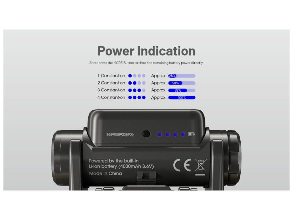 - Indikácia stavu batérie: Pri vypnutom stave krátko stlačte tlačidlo Mode. 4 modré LED pod optikou zobrazia úroveň nabitia (100%, 75%, 50%, 25%).