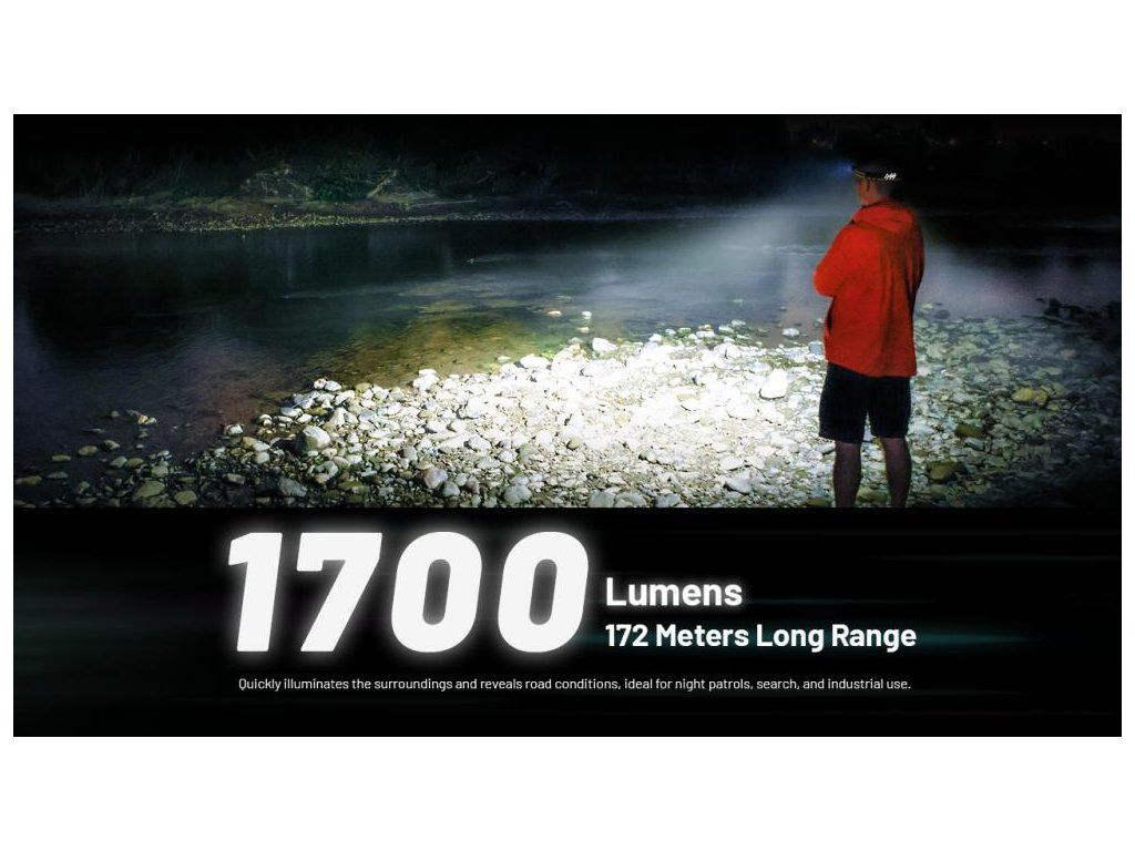 - Okamžitý Turbo výkon: Pri zapnutom svietidle podržte hlavné tlačidlo pre okamžitý skok na 1700 lm.