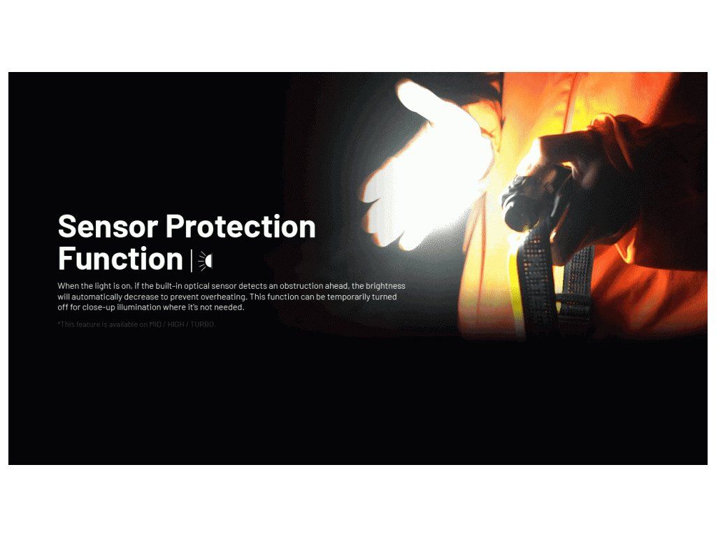 Integrovaný optický senzor je bezpečnostným prvkom, ktorý automaticky zníži jas, ak sa čelovka priblíži k prekážke. Tým sa predchádza oslneniu odrazom svetla alebo poškodeniu materiálov (napr. prepáleniu vrecká batohu) v dôsledku vysokého tepelného vyžarovania pri Turbo režime.
