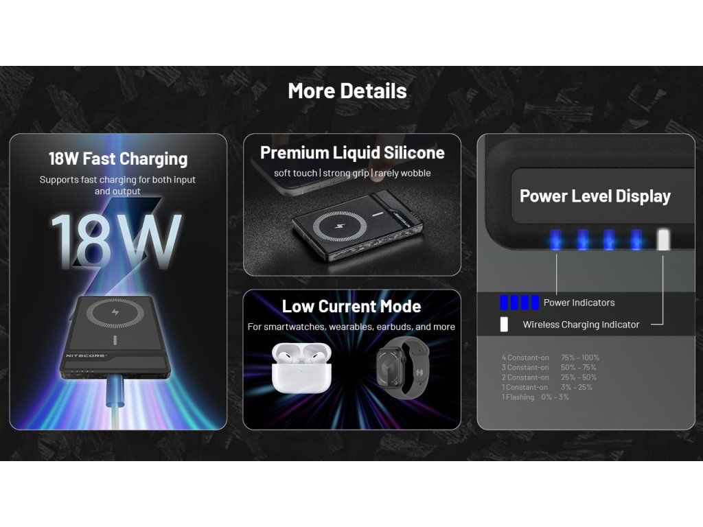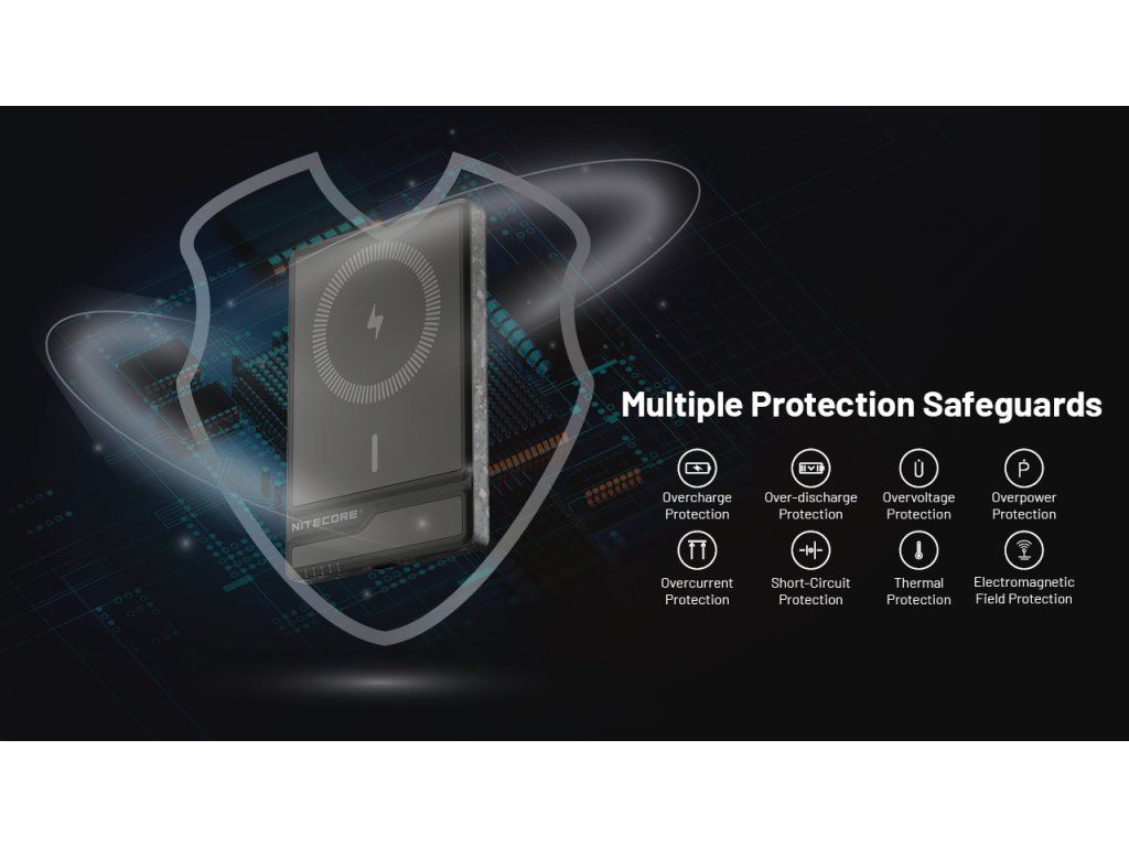 Srdcom zariadenia je procesor, ktorý automaticky deteguje pripojené zariadenie. Pri bezdrôtovom nabíjaní MagSafe sa automaticky aktivuje optimálny výkon (5W/7.5W/10W/15W). USB-C port podporuje protokol QC 3.0 a PD 3.0, čo umožňuje nabiť iPhone na 50 % kapacity už za 30 minút. Integrované ochrany proti skratu, prebitiu a nadmernému vybitiu sú u značky Nitecore samozrejmosťou.