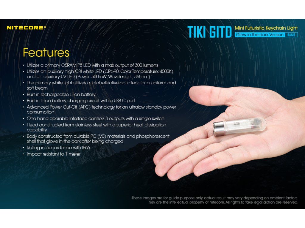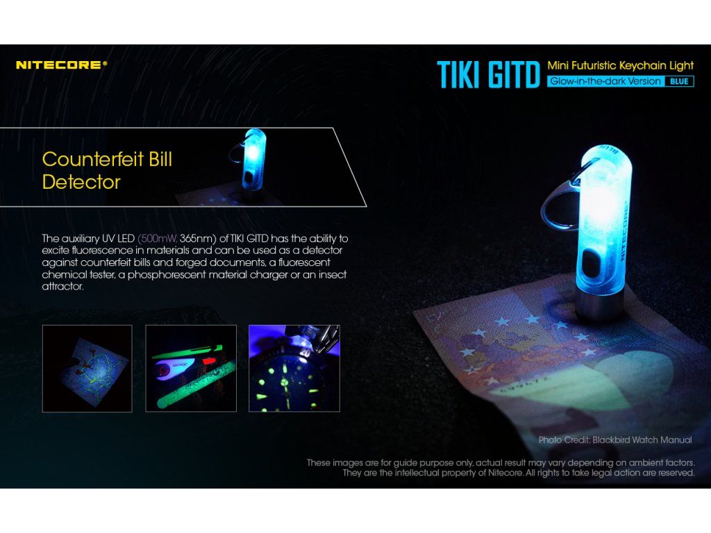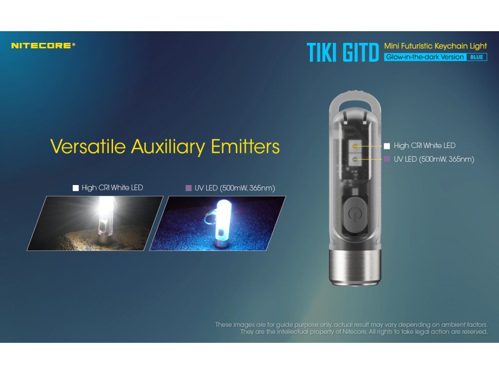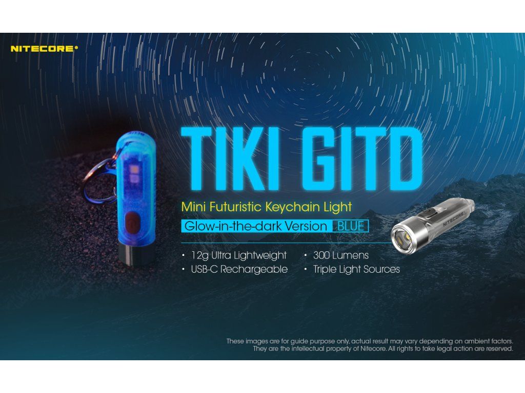 Nitecore TIKI GITD Blue 300 lm – Multifunkčné kľúčenkové svietidlo s UV a fosforovým telom 300 lm | 71 m | Li-ion 130 mAh | IP66 | UV LED