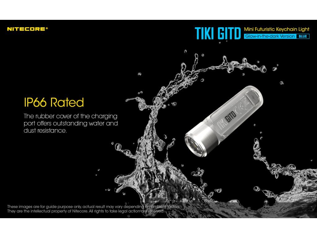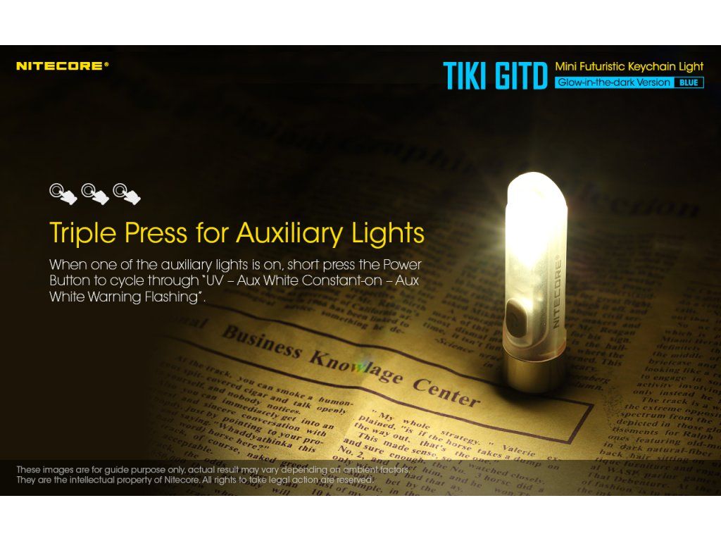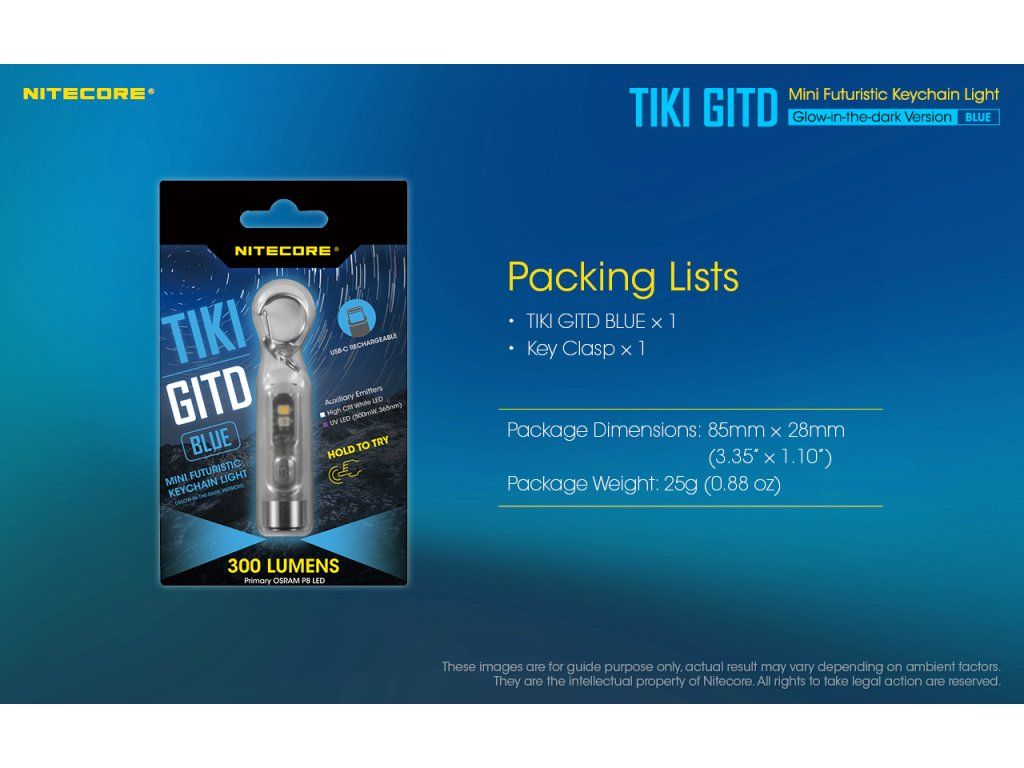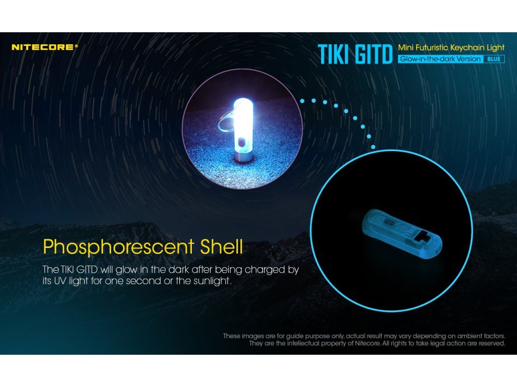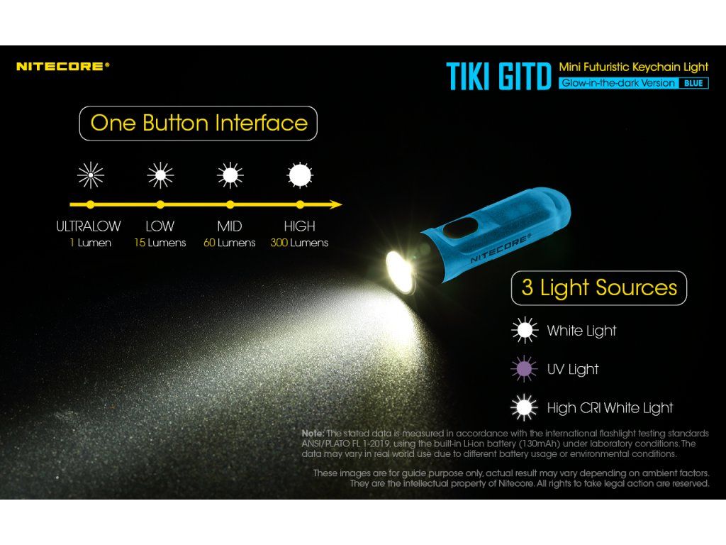 Nitecore TIKI GITD Blue 300 lm – Multifunkčné kľúčenkové svietidlo s UV a fosforovým telom 300 lm | 71 m | Li-ion 130 mAh | IP66 | UV LED