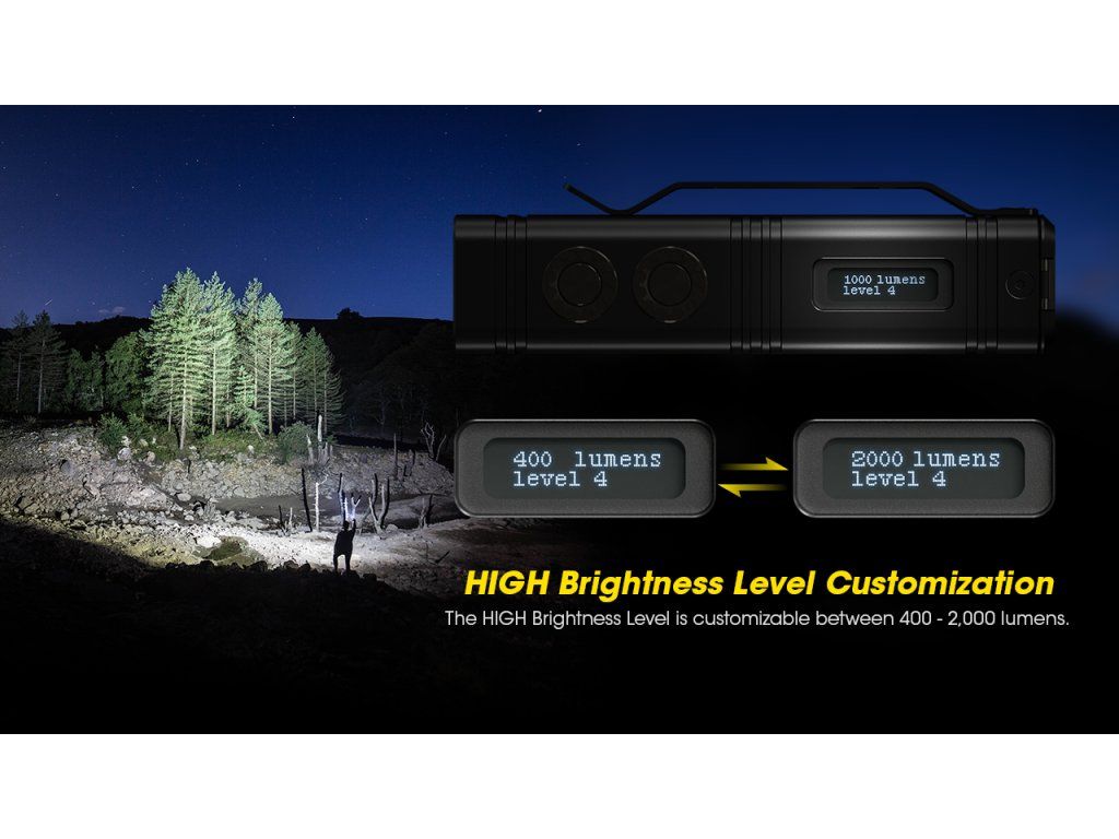 - Programovateľný režim High: Podržte tlačidlo Mode pri zapnutom svietidle. OLED displej zobrazí aktuálne lúmeny. Uvoľnite pri želanej hodnote (medzi 400 a 2000 lm).