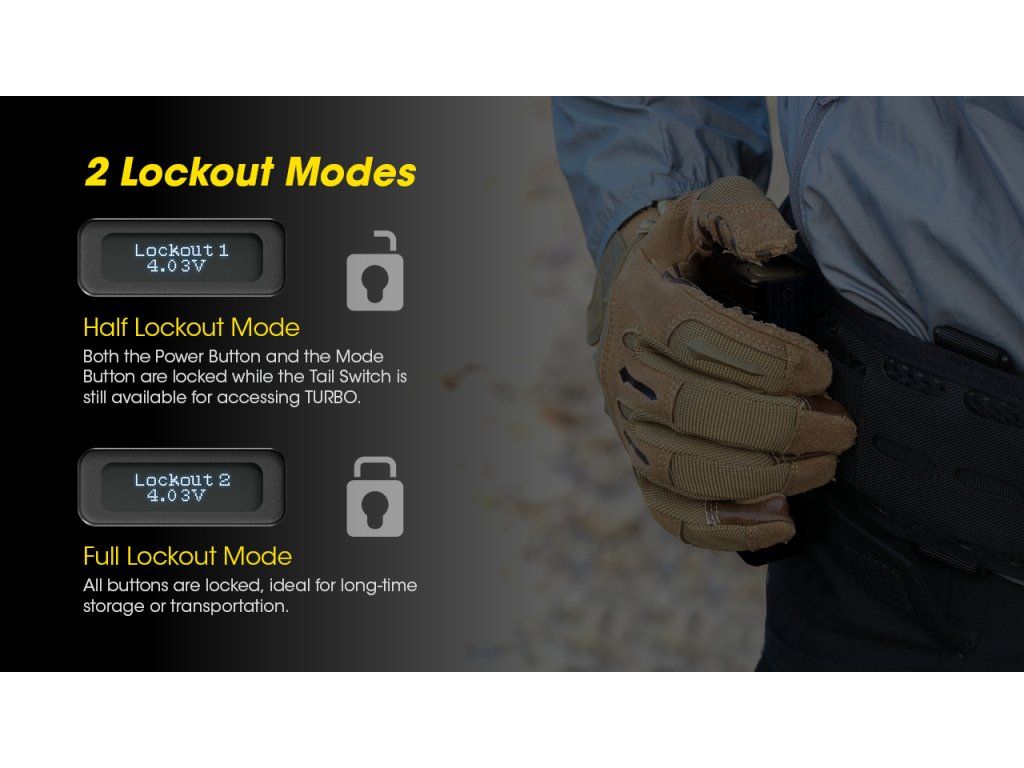- Lockout (Uzamknutie): Režim 1 (Polovičný zámok) blokuje bočné tlačidlá, ale povoľuje Turbo cez zadný spínač. Režim 2 (Úplný zámok) blokuje všetko. Aktivuje sa podržaním Power tlačidla pri zapnutom stave, kým displej nezobrazí Lockout ikonu.