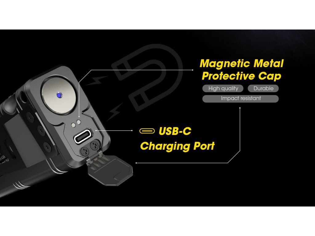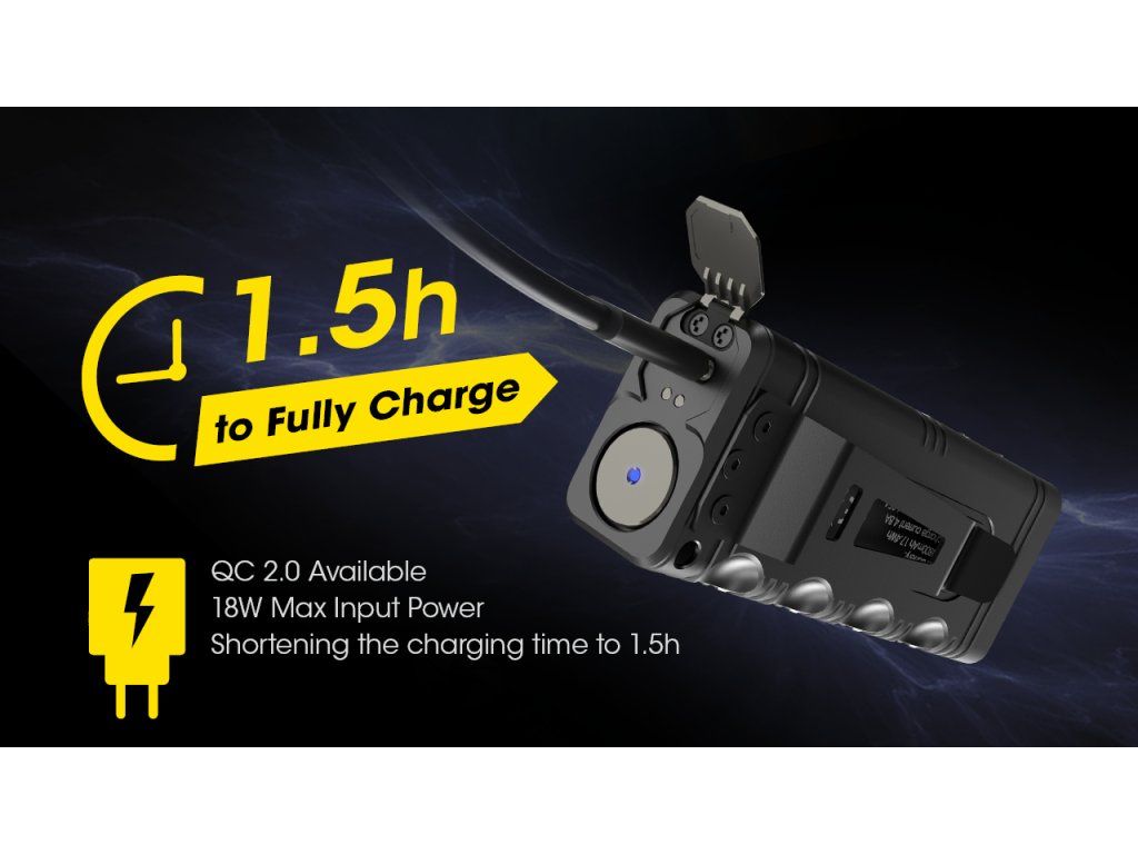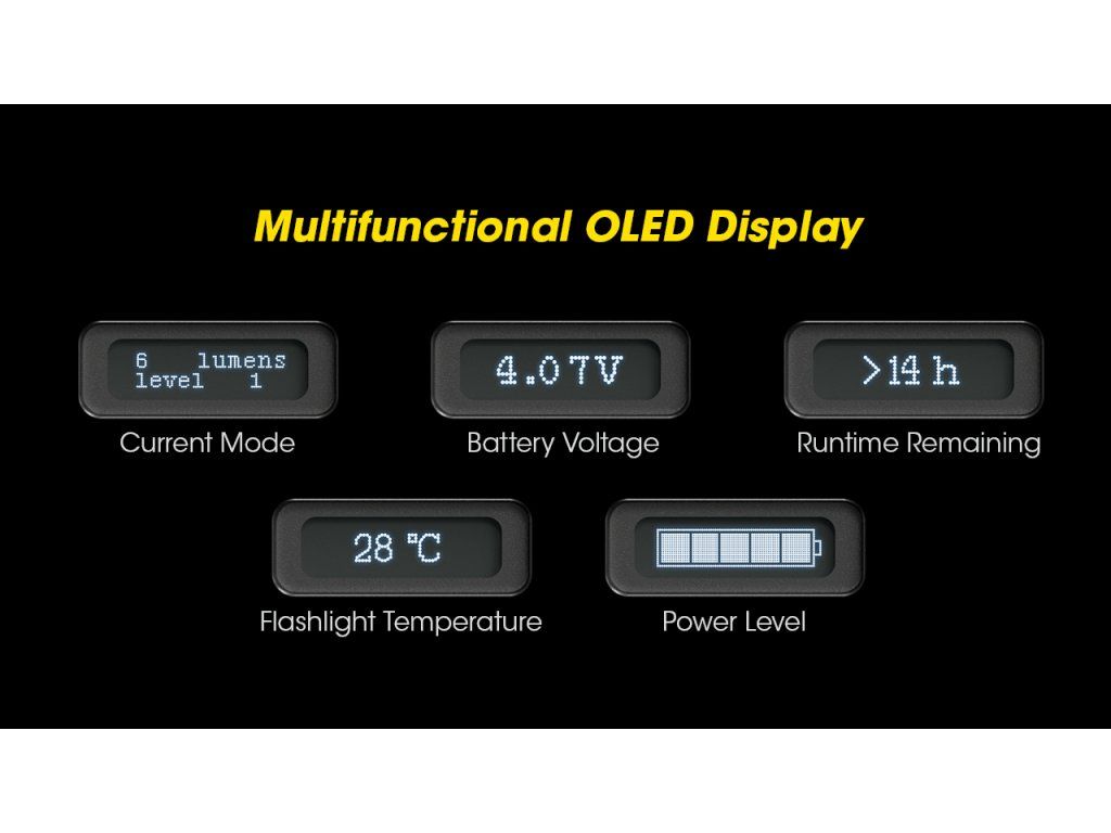 Pokročilý čip riadi odber energie z vysokovýkonného článku typu 21700 s kapacitou 4800 mAh. Elektronika neustále monitoruje teplotu a v prípade potreby reguluje výkon (technológia ATR), aby nedošlo k poškodeniu LED čipov. Na OLED displeji vidíte presný čas do vybitia v každom zvolenom režime.