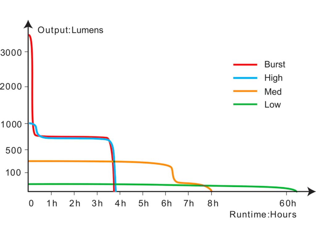 - Päť režimov výkonu: burst 3600 lúmenov (3 h 45 min) -> 1000 lúmenov (3 h 50 min) -> 350 lúmenov (8 hodín) -> 30 lúmenov (60 hodín) -> stroboskop 3000 lúmenov (stroboskopické blikanie s premenlivou frekvenciou).
