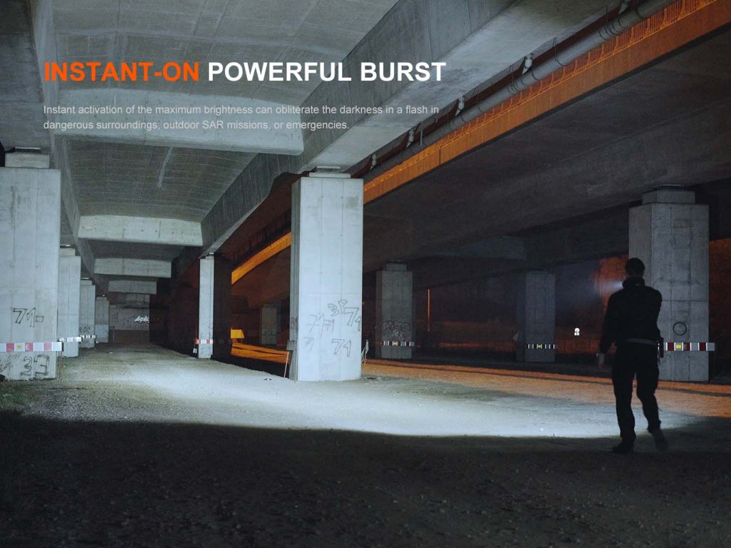 Pre zapnutie stlačte väčšie taktické tlačidlo umiestnené na konci svietidla, pre okamžitú aktiváciu tlačidlo jemne pridržte. Stlačením vedľajšieho prepínacieho tlačidla môžete kedykoľvek počas prevádzky prepínať medzi režimami výkonu. Pre prepnutie do zábleskového režimu pri zapnutom svietidle pridržte prepínacie tlačidlo zhruba 0,5 sekundy. Pre zapnutie svietidla priamo do stroboskopického režimu stlačte a držte prepínacie tlačidlo. Režim BURST (3600 lúmenov) možno tiež kedykoľvek priamo aktivovať podržaním hlavného taktického tlačidla po dobu 0,5 sekundy.