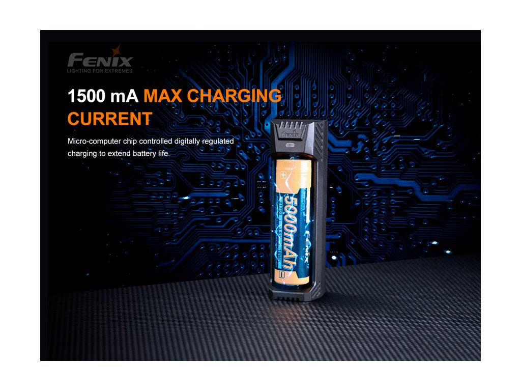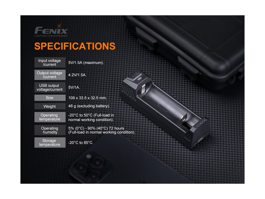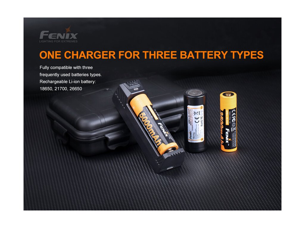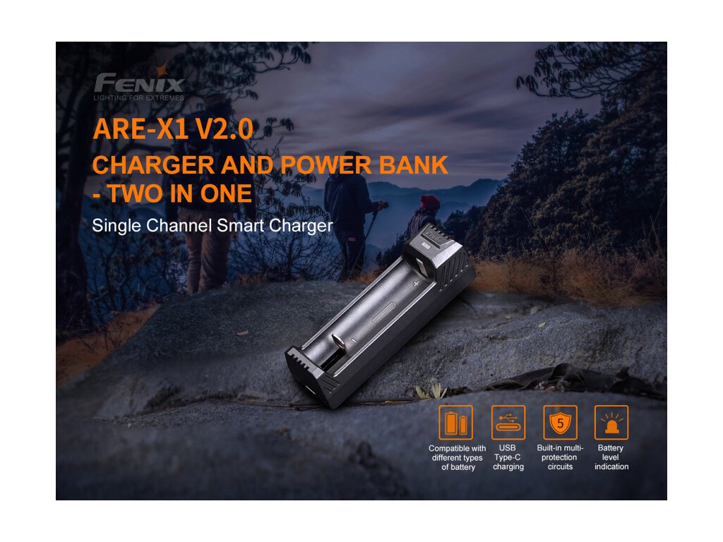 Kompaktná univerzálna USB nabíjačka Fenix ARE-X1 V2.0 na 1x Li-ion akumulátora typu 21700, 26650 či 18650. Pri vložení nabitého akumulátora funguje aj ako záložný zdroj (powerbank) na nabíjanie USB zariadení (mobilné telefóny, MP3 prehrávače a ďalšie). Nabíjačka je určená pre 3,7V a 3,6V lítium-iónové akumulátory s dĺžkou 65–75 milimetrov. Nabíjací prúd až 1500mA, podľa možností USB zdroja do ktorého budete mať nabíjačku pripojenú (počítač, sieťový USB zdroj, nabíjačka na mobilný telefón s Micro-USB). Doba nabíjania sa tak môže pohybovať zhruba od 2-6hod. Vďaka minimálnym rozmerom je nabíjačka vhodná najmä na cesty.
