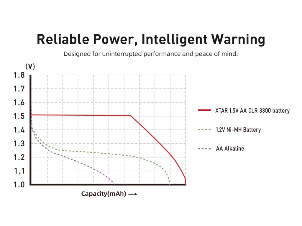 XTAR 1.5V AA CLR 3300 nie je klasická batéria NiMH, ani štandardná 3,6–3,7 V Li-ion bunka – ide o lítium-iónový akumulátor s elektronicky regulovaným výstupom 1,5 V. Interná Li-ion bunka (približne 3,6–3,7 V) je cez obvod redukovaná na stabilné 1,5 V, čo zabezpečuje konzistentné napätie, počas vybitia.